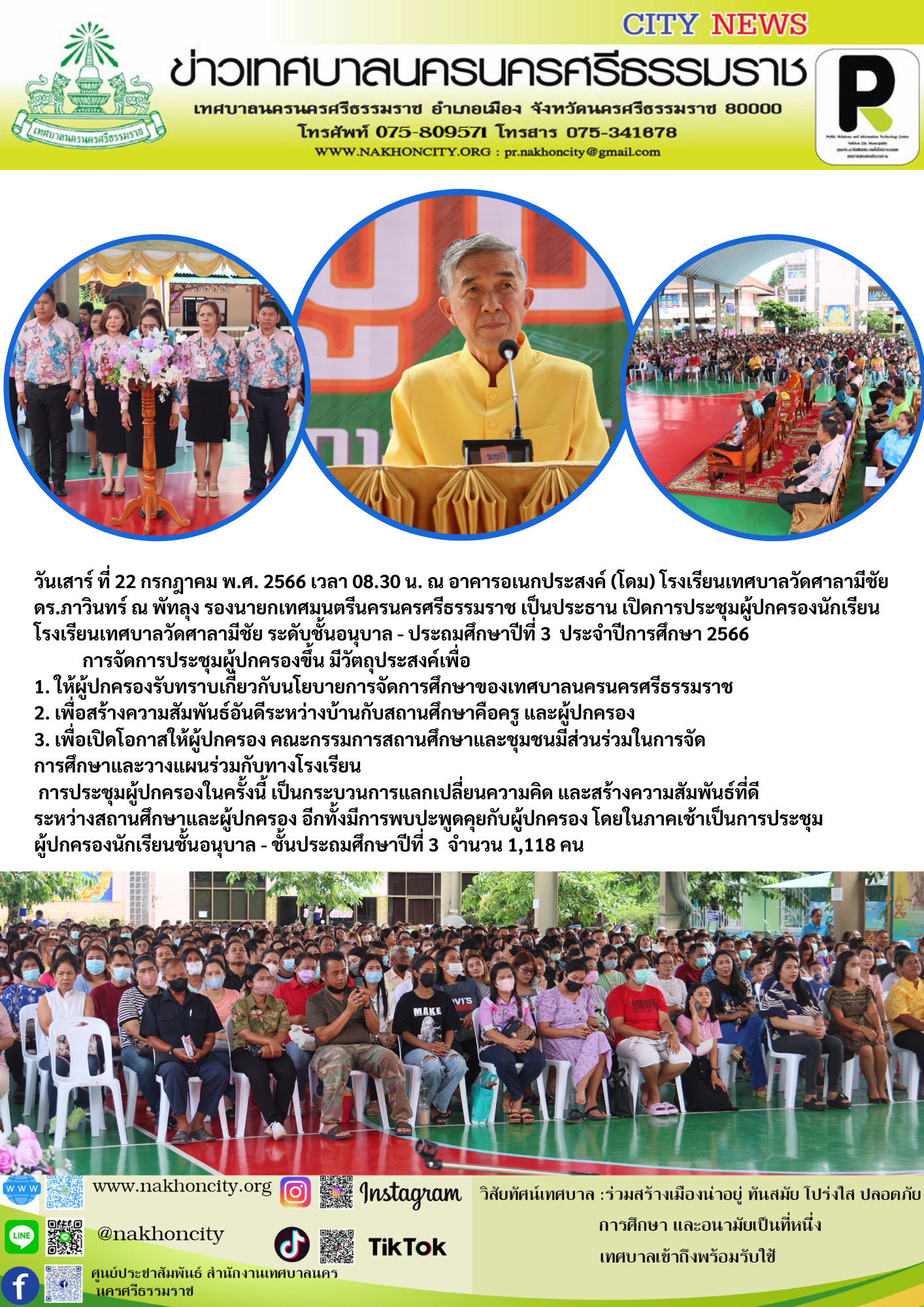 วันเสาร์ ที่ 22 กรกฎาคม พ.ศ. 2566 เวลา 08.30 น. ณ อาคารอเนกประสงค์ (โดม) โรงเรียนเทศบาลวัดศาลามีชัย ดร.ภาวินทร์ ณ พัทลุง รองนายกเทศมนตรีนครนครศรีธรรมราช เป็นประธาน เปิดการประชุมผู้ปกครองนักเรียนโรงเรียนเทศบาลวัดศาลามีชัย ระดับชั้นอนุบาล - ประถมศึกษาปีที่ 3 ประจำปีการศึกษา 2566 การจัดการประชุมผู้ปกครองขึ้น มีวัตถุประสงค์เพื่อ 1. ให้ผู้ปกครองรับทราบเกี่ยวกับนโยบายการจัดการศึกษาของเทศบาลนครนครศรีธรรมราช 2. เพื่อสร้างความสัมพันธ์อันดีระหว่างบ้านกับสถานศึกษาคือครู และผู้ปกครอง 3. เพื่อเปิดโอกาสให้ผู้ปกครอง คณะกรรมการสถานศึกษาและชุมชนมีส่วนร่วมในการจัด การศึกษาและวางแผนร่วมกับทางโรงเรียน การประชุมผู้ปกครองในครั้งนี้ เป็นกระบวนการแลกเปลี่ยนความคิด และสร้างความสัมพันธ์ที่ดี ระหว่างสถานศึกษาและผู้ปกครอง อีกทั้งมีการพบปะพูดคุยกับผู้ปกครอง โดยในภาคเช้าเป็นการประชุม ผู้ปกครองนักเรียนชั้นอนุบาล - ชั้นประถมศึกษาปีที่ 3 จำนวน 1,118 คน