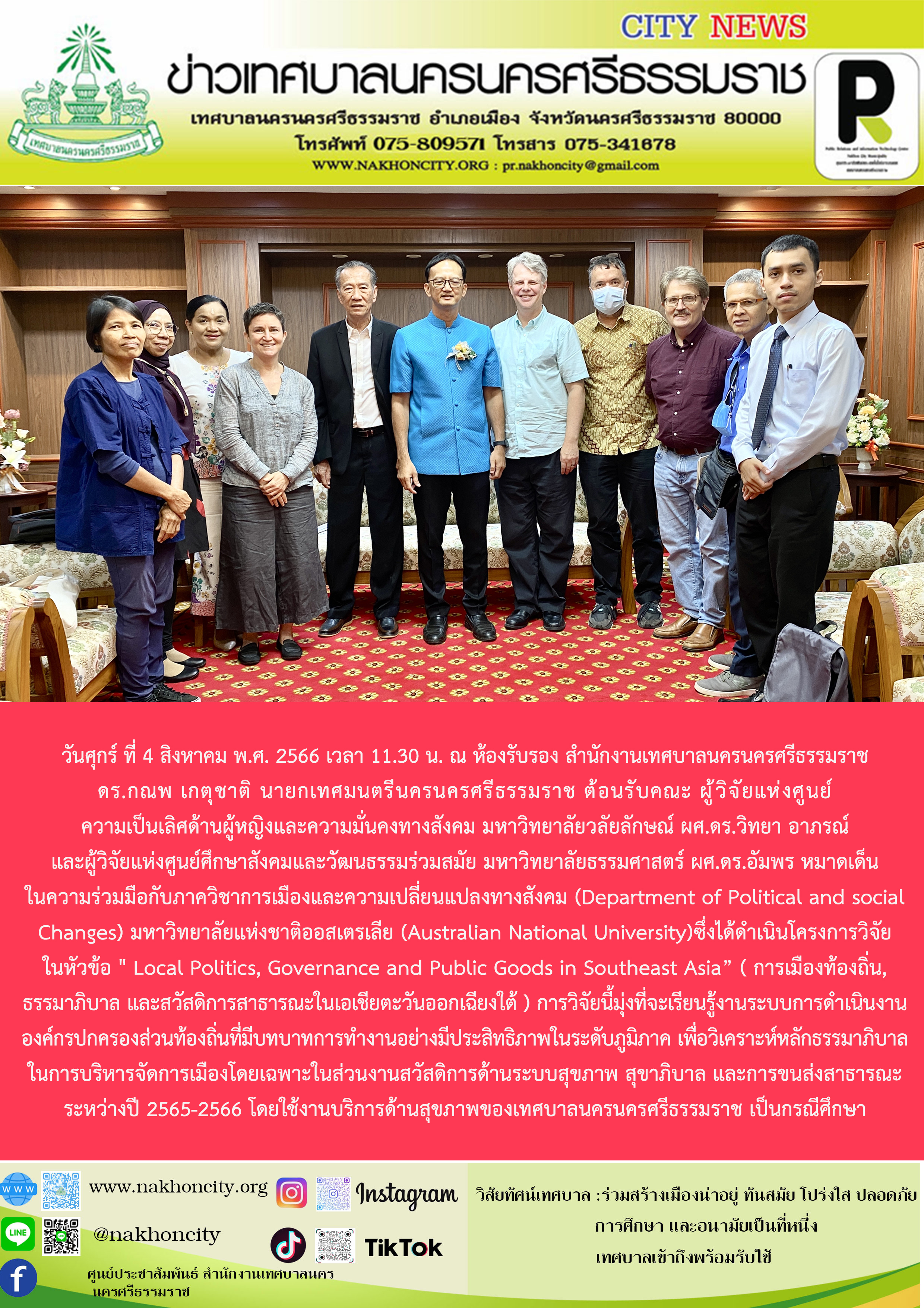 ดร.กณพ เกตุชาติ นายกเทศมนตรีนครนครศรีธรรมราช ต้อนรับคณะ ผู้วิจัยแห่งศูนย์ความเป็นเลิศด้านผู้หญิงและความมั่นคงทางสังคม มหาวิทยาลัยวลัยลักษณ์ ผศ.ดร.วิทยา อาภรณ์ และผู้วิจัยแห่งศูนย์ศึกษาสังคมและวัฒนธรรมร่วมสมัย มหาวิทยาลัยธรรมศาสตร์ ผศ.ดร.อัมพร หมาดเด็น ในความร่วมมือกับภาควิชาการเมืองและความเปลี่ยนแปลงทางสังคม (Department of Political and social Changes) มหาวิทยาลัยแห่งชาติออสเตรเลีย (Australian National University) |