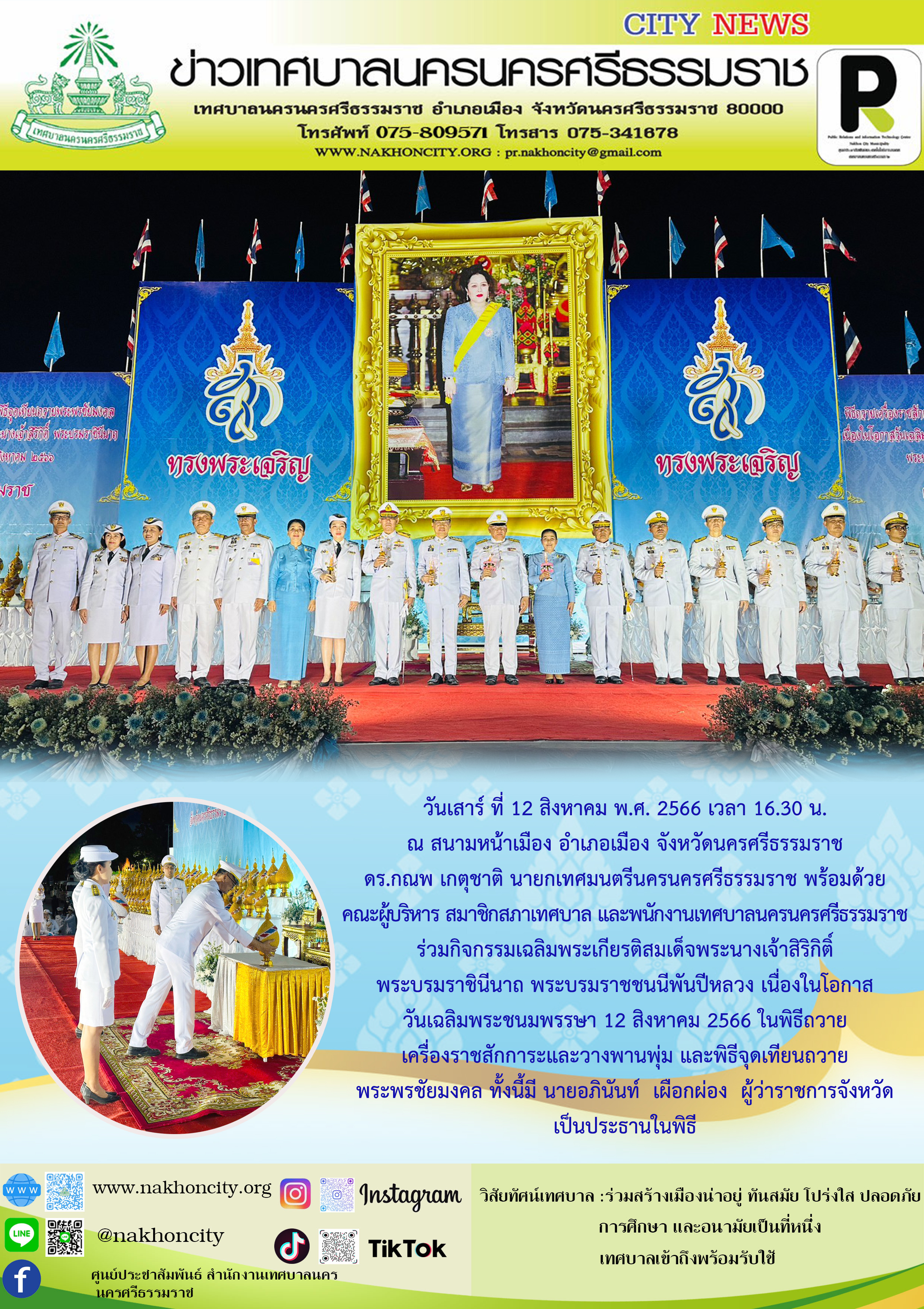 | ดร.กณพ เกตุชาติ นายกเทศมนตรีนครนครศรีธรรมราช พร้อมด้วยคณะผู้บริหาร สมาชิกสภาเทศบาล และพนักงานเทศบาลนครนครศรีธรรมราช ร่วมกิจกรรมเฉลิมพระเกียรติสมเด็จพระนางเจ้าสิริกิติ์ พระบรมราชินีนาถ พระบรมราชชนนีพันปีหลวง เนื่องในโอกาสวันเฉลิมพระชนมพรรษา 12 สิงหาคม 2566 ในพิธีถวายเครื่องราชสักการะและวางพานพุ่ม และพิธีจุดเทียนถวายพระพรชัยมงคล |