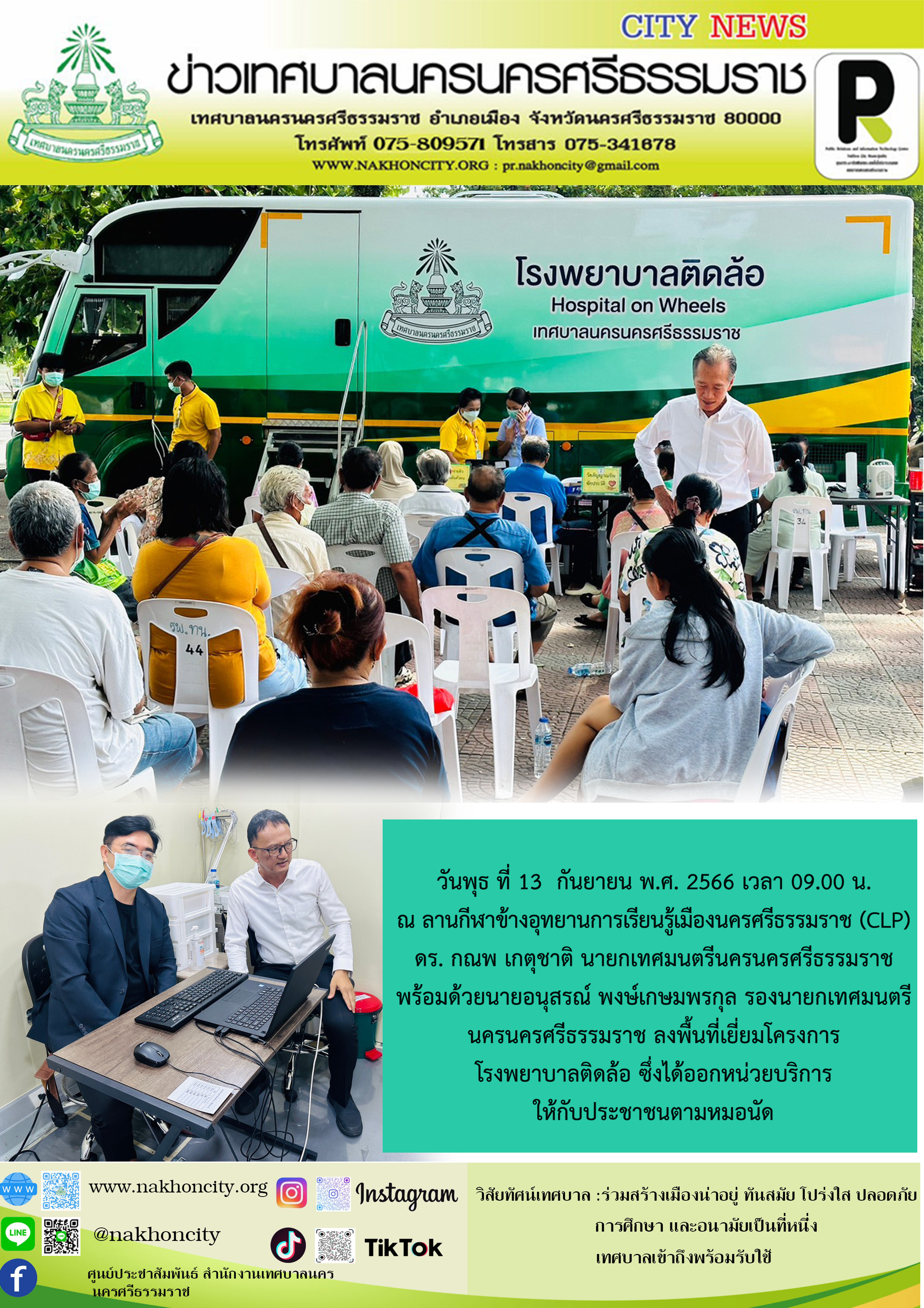ดร. กณพ เกตุชาติ นายกเทศมนตรีนครนครศรีธรรมราชพร้อมด้วยนายอนุสรณ์ พงษ์เกษมพรกุล รองนายกเทศมนตรีนครนครศรีธรรมราช ลงพื้นที่เยี่ยมโครงการโรงพยาบาลติดล้อ |