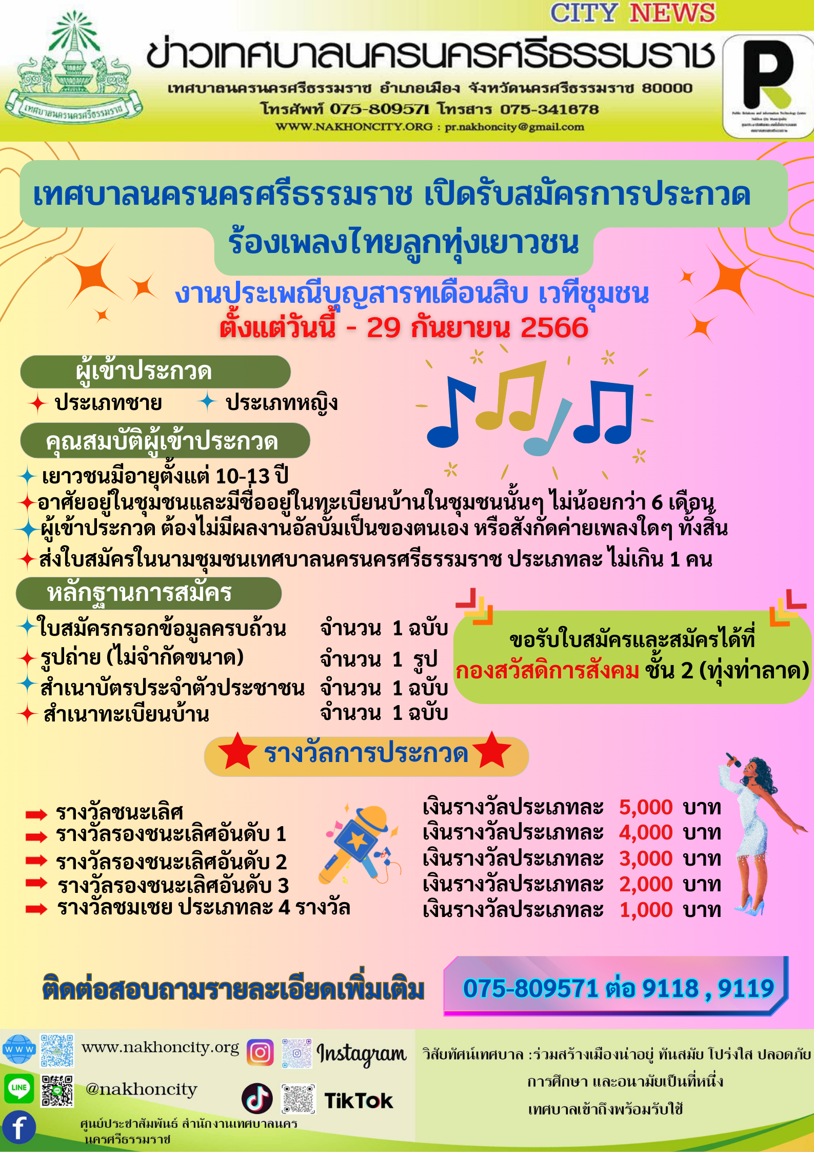 กองสวัสดิการสังคมการสังคม เปิดรับสมัครการประกวดร้องเพลงไทยลูกทุ่งเยาวชน ตั้งแต่วันนี้ -29 กันยายน 2566