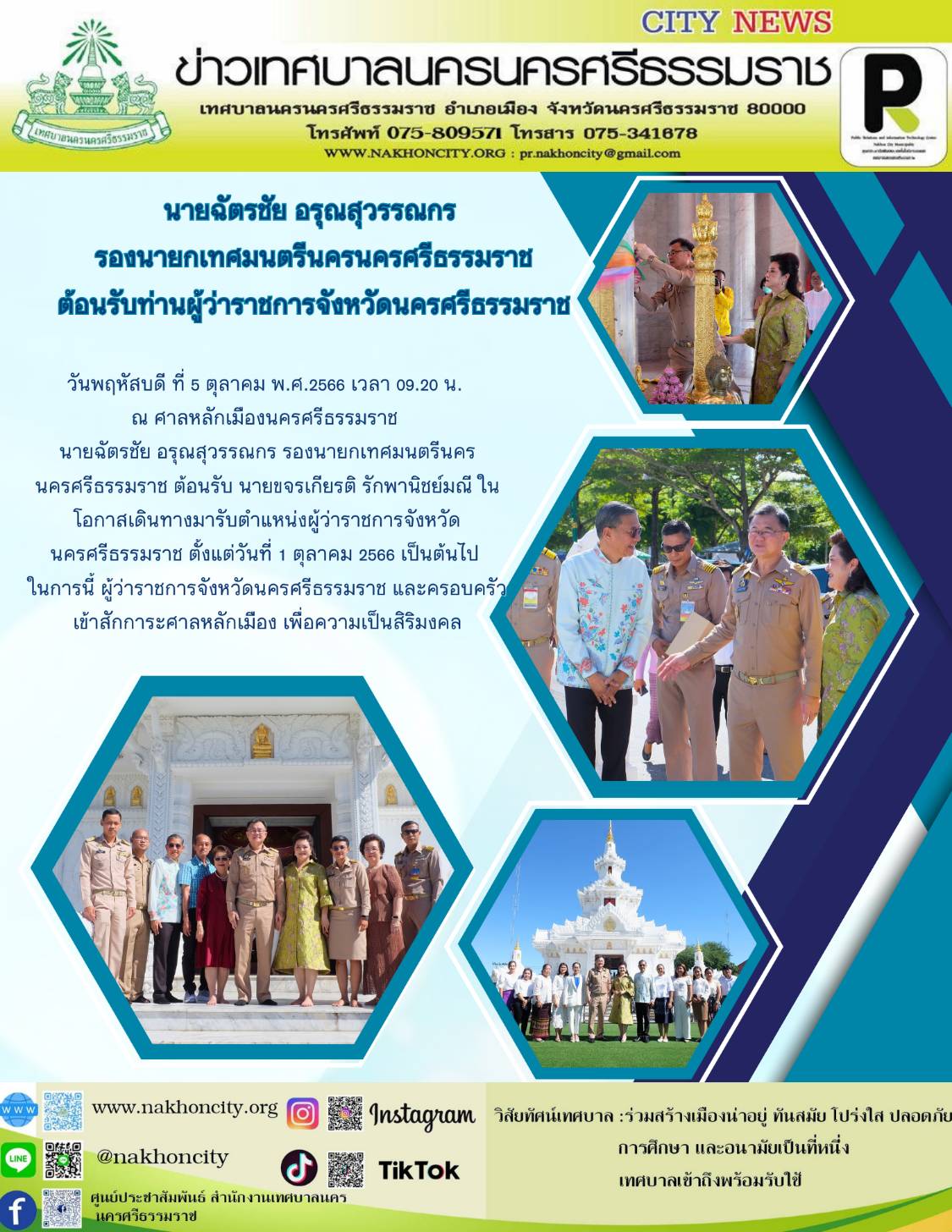 วันพฤหัสบดี ที่ 5 ตุลาคม พ.ศ.2566 เวลา 09.20 น. ณ ศาลหลักเมืองนครศรีธรรมราช นายฉัตรชัย อรุณสุวรรณกร รองนายกเทศมนตรีนครนครศรีธรรมราช ต้อนรับ นายขจรเกียรติ รักพานิชย์มณี ในโอกาสเดินทางมารับตำแหน่งผู้ว่าราชการจังหวัดนครศรีธรรมราช ตั้งแต่วันที่ 1 ตุลาคม 2566 เป็นต้นไป ในการนี้ ผู้ว่าราชการจังหวัดนครศรีธรรมราช และครอบครัว เข้าสักการะศาลหลักเมือง เพื่อความเป็นสิริมงคล ............. ภาพ//ข่าว//จันทร์จิรา |