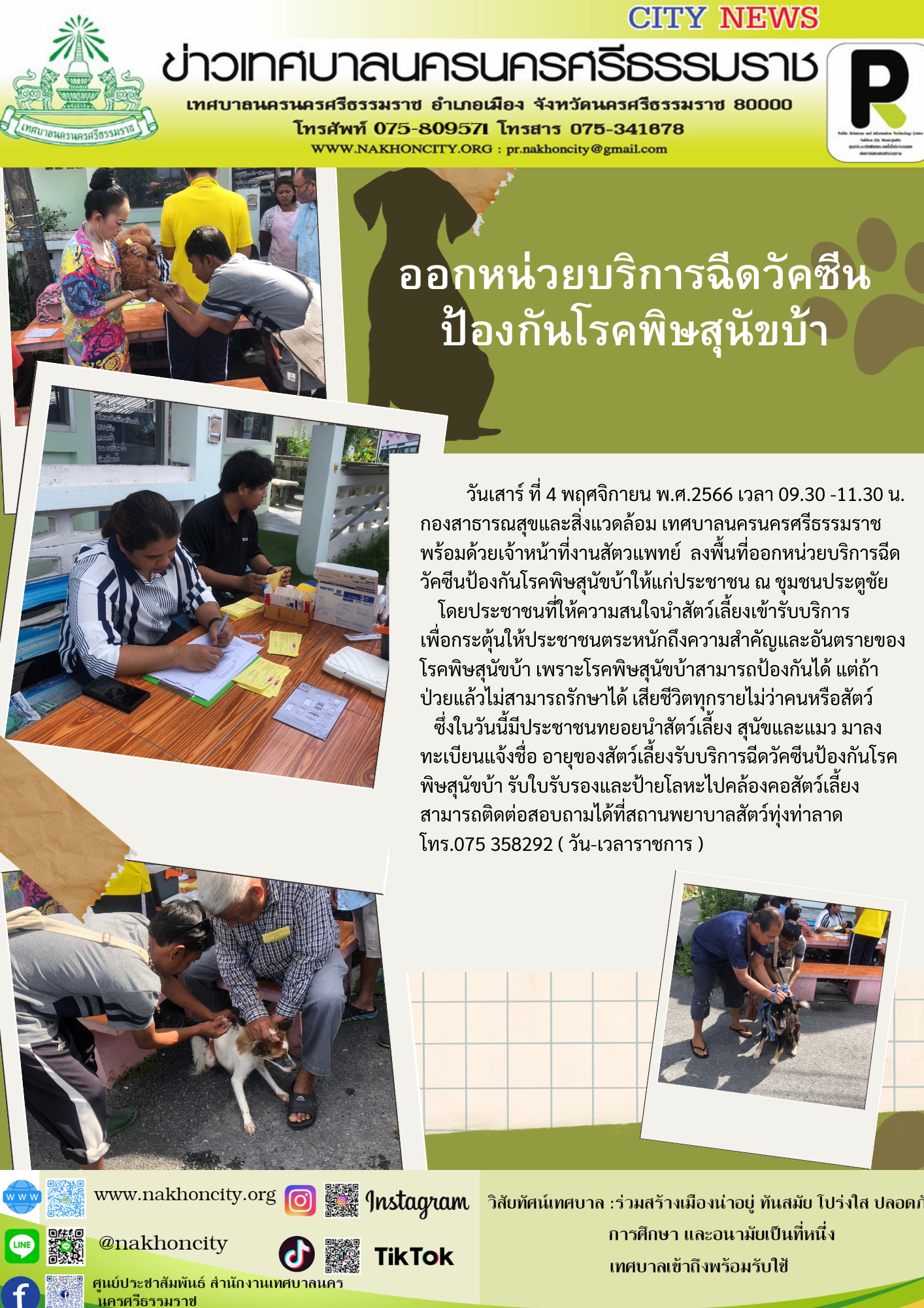กองสาธารณสุขและสิ่งแวดล้อม เทศบาลนครนครศรีธรรมราช พร้อมด้วยเจ้าหน้าที่งานสัตวแพทย์ ลงพื้นที่ออกหน่วยบริการฉีดวัคซีนป้องกันโรคพิษสุนัขบ้าให้แก่ประชาชน ณ ชุมชนประตูชัย |
