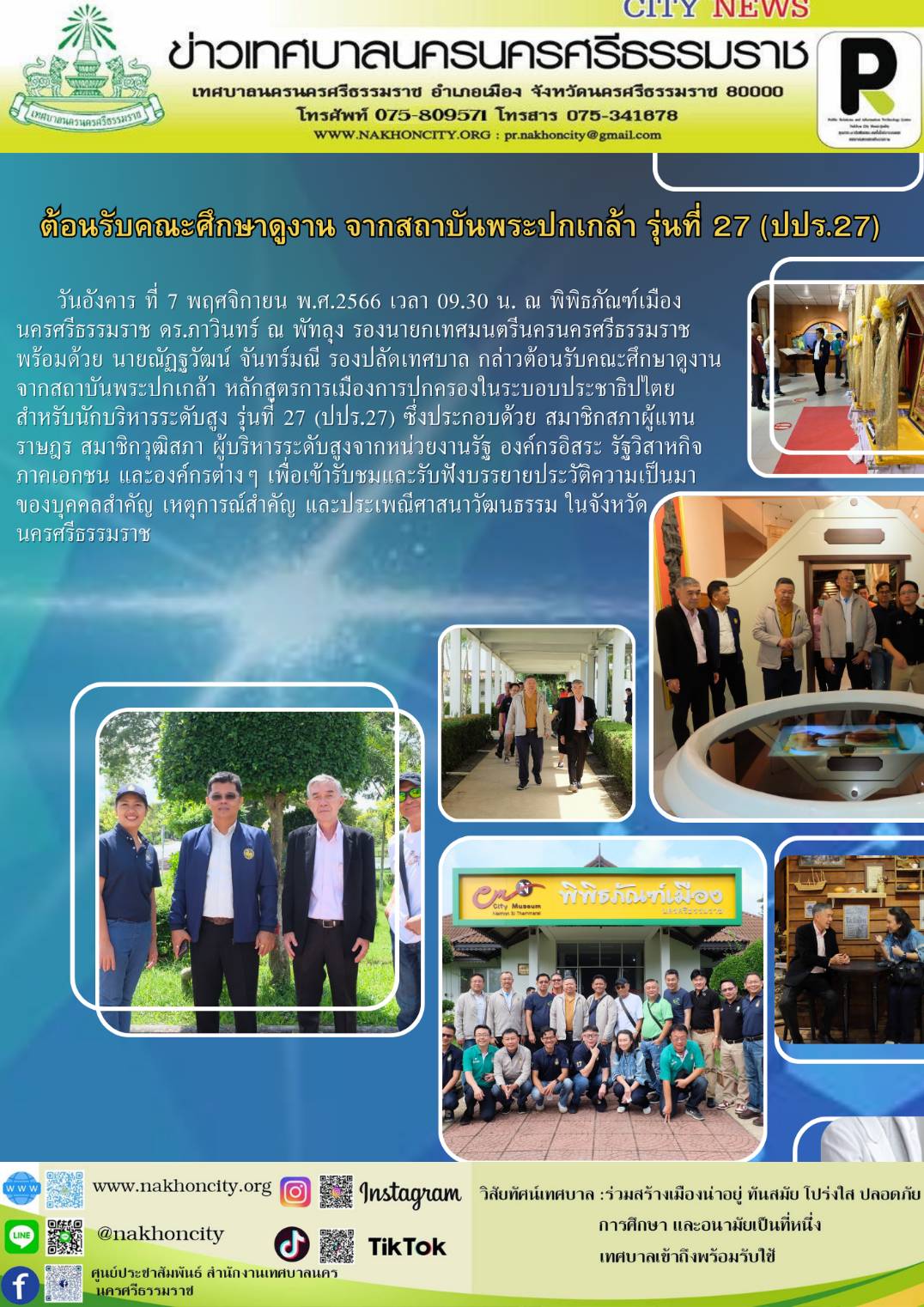 วันอังคาร ที่ 7 พฤศจิกายน พ.ศ.2566 เวลา 09.30 น. ณ พิพิธภัณฑ์เมืองนครศรีธรรมราช ดร.ภาวินทร์ ณ พัทลุง รองนายกเทศมนตรีนครนครศรีธรรมราช พร้อมด้วย นายณัฏฐวัฒน์ จันทร์มณี รองปลัดเทศบาล กล่าวต้อนรับคณะศึกษาดูงาน จากสถาบันพระปกเกล้า หลักสูตรการเมืองการปกครองในระบอบประชาธิปไตยสำหรับนักบริหารระดับสูง รุ่นที่ 27 (ปปร.27) ซึ่งประกอบด้วย สมาชิกสภาผู้แทนราษฎร สมาชิกวุฒิสภา ผู้บริหารระดับสูงจากหน่วยงานรัฐ องค์กรอิสระ รัฐวิสาหกิจ ภาคเอกชน และองค์กรต่างๆ เพื่อเข้ารับชมและรับฟังบรรยายประวัติความเป็นมาของบุคคลสำคัญ เหตุการณ์สำคัญ และประเพณีศาสนาวัฒนธรรม ในจังหวัดนครศรีธรรมราช |