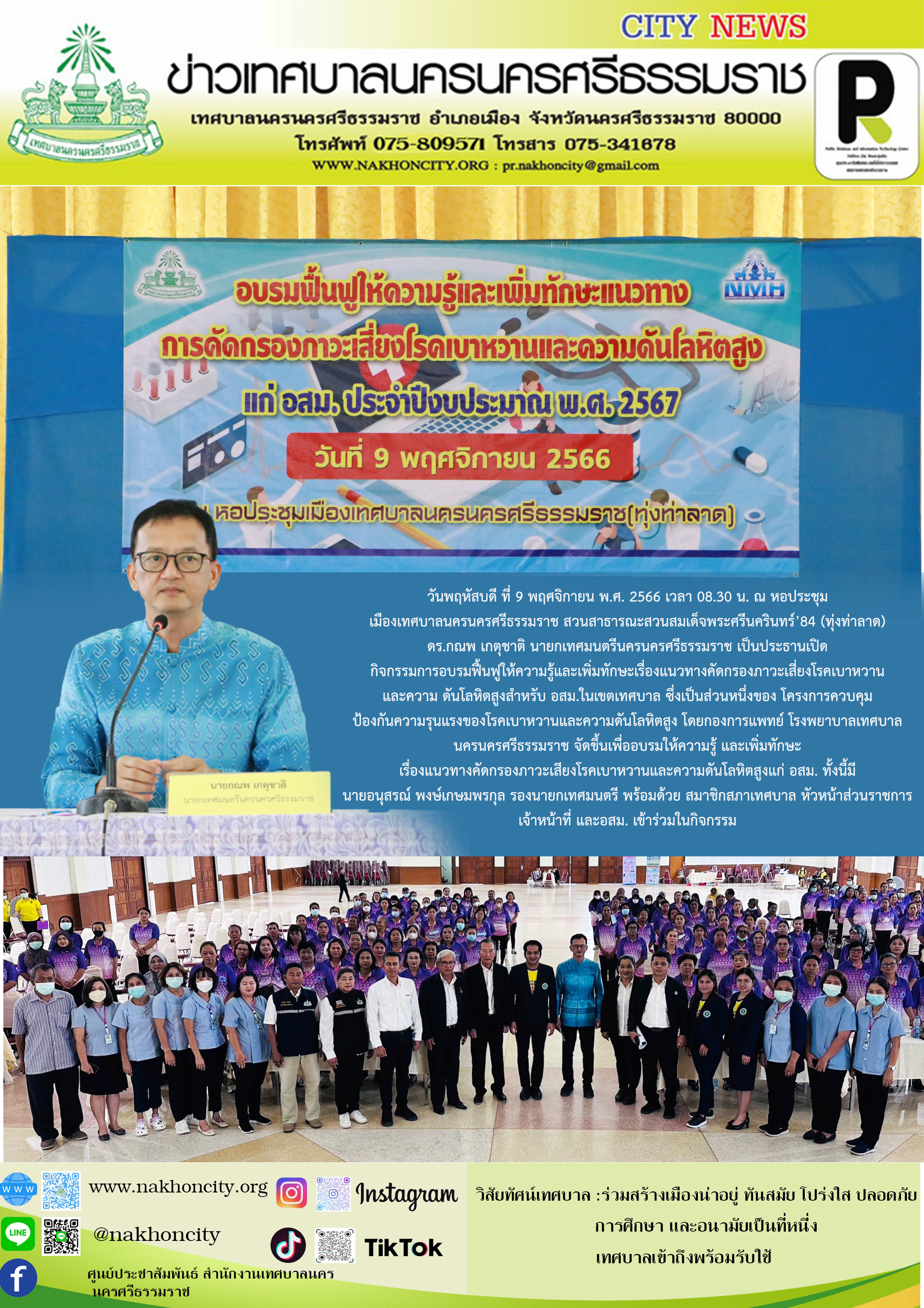 วันพฤหัสบดี ที่ 9 พฤศจิกายน พ.ศ. 2566 เวลา 08.30 น. ณ หอประชุมเมืองเทศบาลนครนครศรีธรรมราช สวนสาธารณะสวนสมเด็จพระศรีนครินทร์’84 (ทุ่งท่าลาด) ดร.กณพ เกตุชาติ นายกเทศมนตรีนครนครศรีธรรมราช เป็นประธานเปิดกิจกรรมการอบรมฟื้นฟูให้ความรู้และเพิ่มทักษะเรื่องแนวทางคัดกรองภาวะเสี่ยงโรคเบาหวานและความ ดันโลหิตสูงสำหรับ อสม.ในเขตเทศบาล ซึ่งเป็นส่วนหนึ่งของโครงการ ควบคุมป้องกันความรุนแรงของโรคเบาหวานและความดันโลหิตสูง โดยกองการแพทย์ โรงพยาบาลเทศบาลนครนครศรีธรรมราช จัดขึ้นเพื่ออบรมให้ความรู้ และเพิ่มทักษะเรื่องแนวทางคัดกรองภาวะเสียงโรคเบาหวานและความดันโลหิตสูงแก่ อสม. ทั้งนี้มีนายอนุสรณ์ พงษ์เกษมพรกุล รองนายกเทศมนตรี พร้อมด้วย สมาชิกสภาเทศบาล หัวหน้าส่วนราชการ เจ้าหน้าที่ และอสม. เข้าร่วมในกิจกรรม