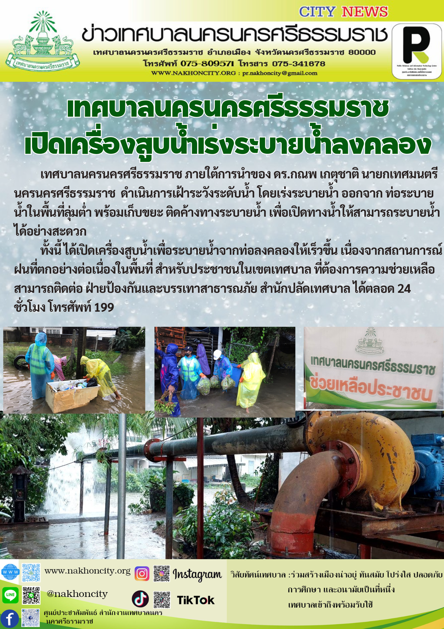 เทศบาลนครนครศรีธรรมราช เปิดเครื่องสูบน้ำเร่งระบายน้ำลงคลอง |