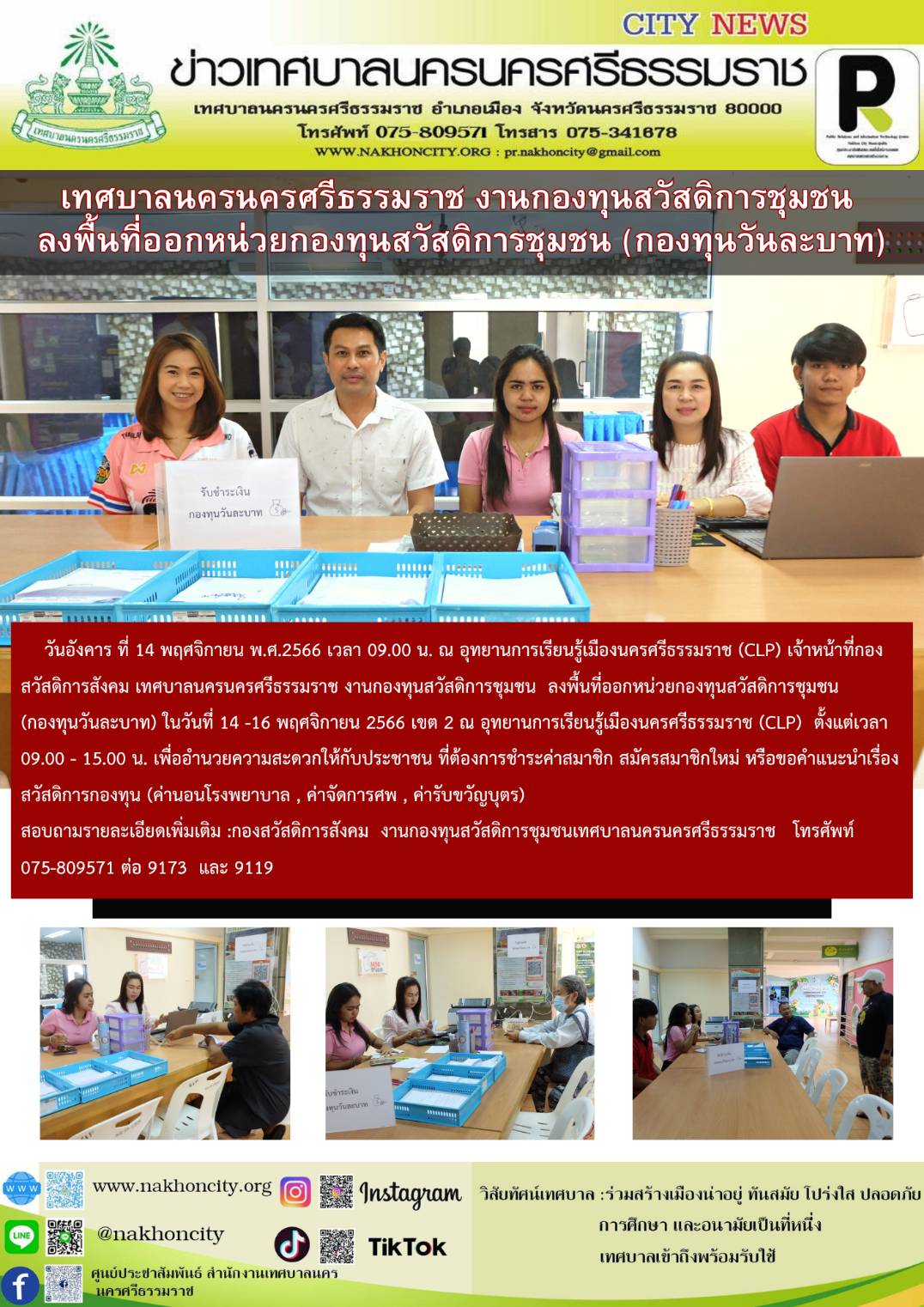 | เจ้าหน้าที่กองสวัสดิการสังคม เทศบาลนครนครศรีธรรมราช งานกองทุนสวัสดิการชุมชน ลงพื้นที่ออกหน่วยกองทุนสวัสดิการชุมชน (กองทุนวันละบาท) |