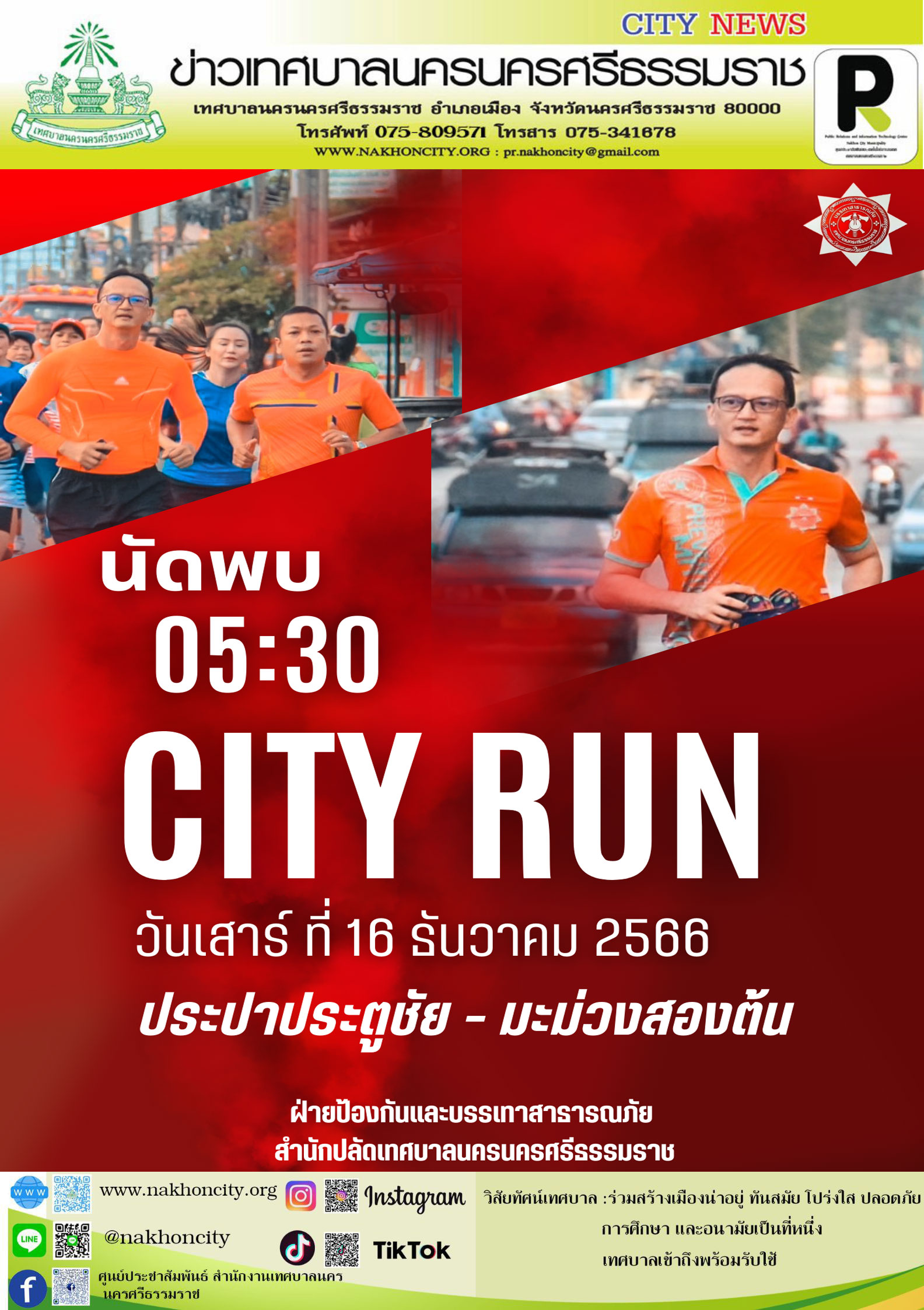 เทศบาลนครนครศรีธรรมราช ภายใต้การนำ ดร.กณพ เกตุชาติ นายกเทศมนตรีนครนครศรีธรรมราช เชิญชวนประชาชน ร่วมวิ่งออกกำลังกาย ทุกเช้าวันเสาร์ เวลา 05.30 น.เป็นต้นไป กับกิจกรรม "City Run" พร้อมกับ เจ้าหน้าที่ฝ่ายป้องกันและบรรเทาสาธารณภัย และบุคลากร ของ เทศบาลนครนครศรีธรรมราช ซึ่งใน วันเสาร์ที่ 16 ธันวาคม 2566 นี้ ขอเชิญชวนผู้ที่จะเข้าร่วมกิจกรรมทุกท่าน พบกันที่ โรงกรองน้ำประปาประตูชัย วิ่งจากโรงกรองประตูชัย ไปออกถนนพุทธภูมิ ถนนเลียบทางรถไฟ เข้าถนนมะม่วงสองต้น ออกมาโรงกรองประตูชัย กิจกรรมการวิ่งในครั้งนี้ จัดขึ้นเพื่อสำรวจเส้นทาง เตรียมความพร้อม ในด้านการปฏิบัติงาน ให้กับเจ้าหน้าที่ฝ่ายป้องกันและบรรเทาสาธารณภัย และเป็นการส่งเสริมการออกกำลังกาย ให้กับประชาชน