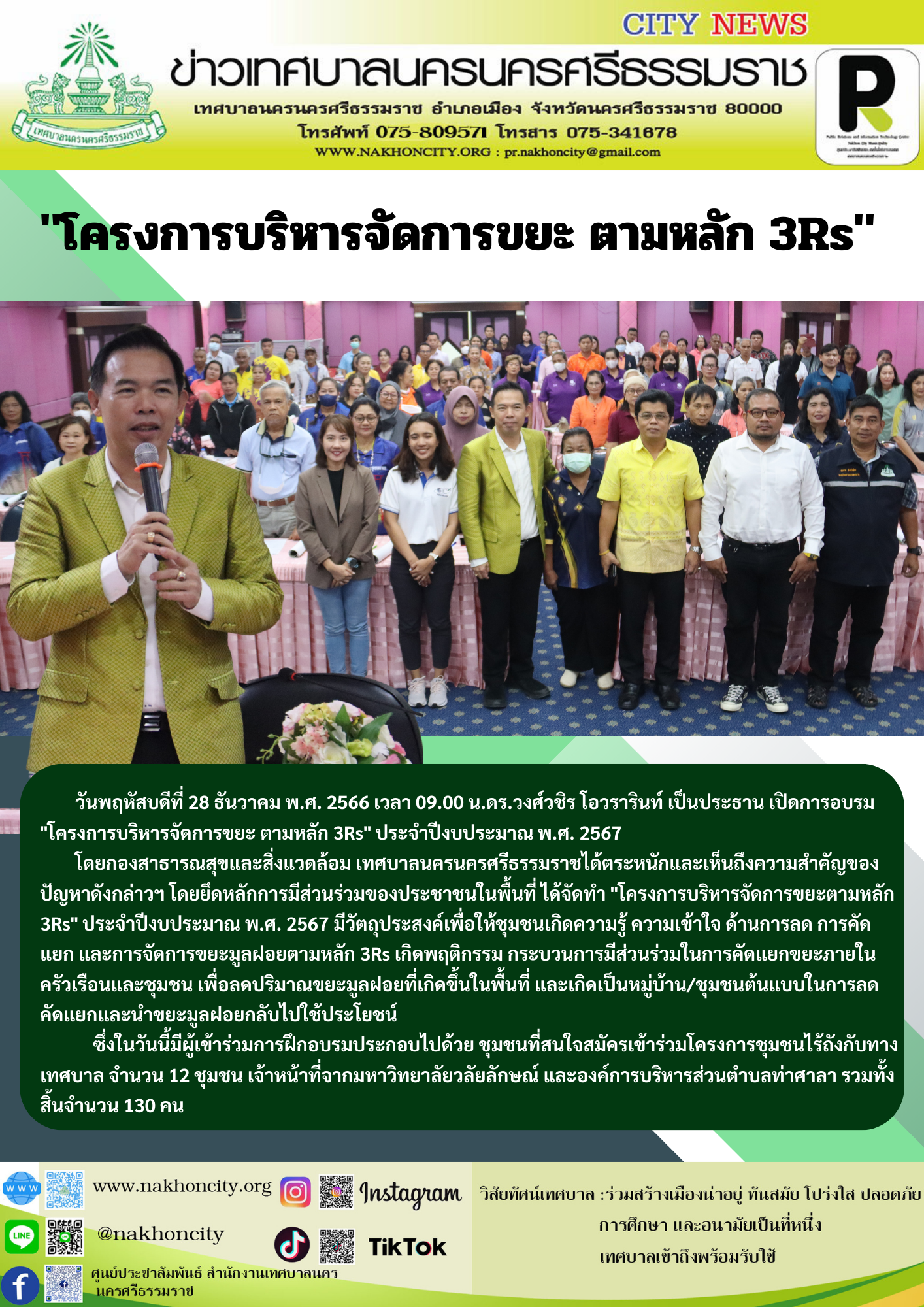 วันพฤหัสบดีที่ 28 ธันวาคม พ.ศ. 2566 เวลา 09.00 น.ดร.วงศ์วชิร โอวรารินท์ เป็นประธาน เปิดการอบรม "โครงการบริหารจัดการขยะ ตามหลัก 3Rs" ประจำปีงบประมาณ พ.ศ. 2567 โดยกองสาธารณสุขและสิ่งแวดล้อม เทศบาลนครนครศรีธรรมราชได้ตระหนักและเห็นถึงความสำคัญของปัญหาดังกล่าวฯ โดยยึดหลักการมีส่วนร่วมของประชาชนในพื้นที่ ได้จัดทำ "โครงการบริหารจัดการขยะตามหลัก 3Rs" ประจำปีงบประมาณ พ.ศ. 2567 มีวัตถุประสงค์เพื่อให้ชุมชนเกิดความรู้ ความเข้าใจ ด้านการลด การคัดแยก และการจัดการขยะมูลฝอยตามหลัก 3Rs เกิดพฤติกรรม กระบวนการมีส่วนร่วมในการคัดแยกขยะภายในครัวเรือนและชุมชน เพื่อลดปริมาณขยะมูลฝอยที่เกิดขึ้นในพื้นที่ และเกิดเป็นหมู่บ้าน/ชุมชนต้นแบบในการลด คัดแยกและนำขยะมูลฝอยกลับไปใช้ประโยชน์ ซึ่งในวันนี้มีผู้เข้าร่วมการฝึกอบรมประกอบไปด้วย ชุมชนที่สนใจสมัครเข้าร่วมโครงการชุมชนไร้ถังกับทางเทศบาล จำนวน 12 ชุมชน เจ้าหน้าที่จากมหาวิทยาลัยวลัยลักษณ์ และองค์การบริหารส่วนตำบลท่าศาลา รวมทั้งสิ้นจำนวน 130 คน |
