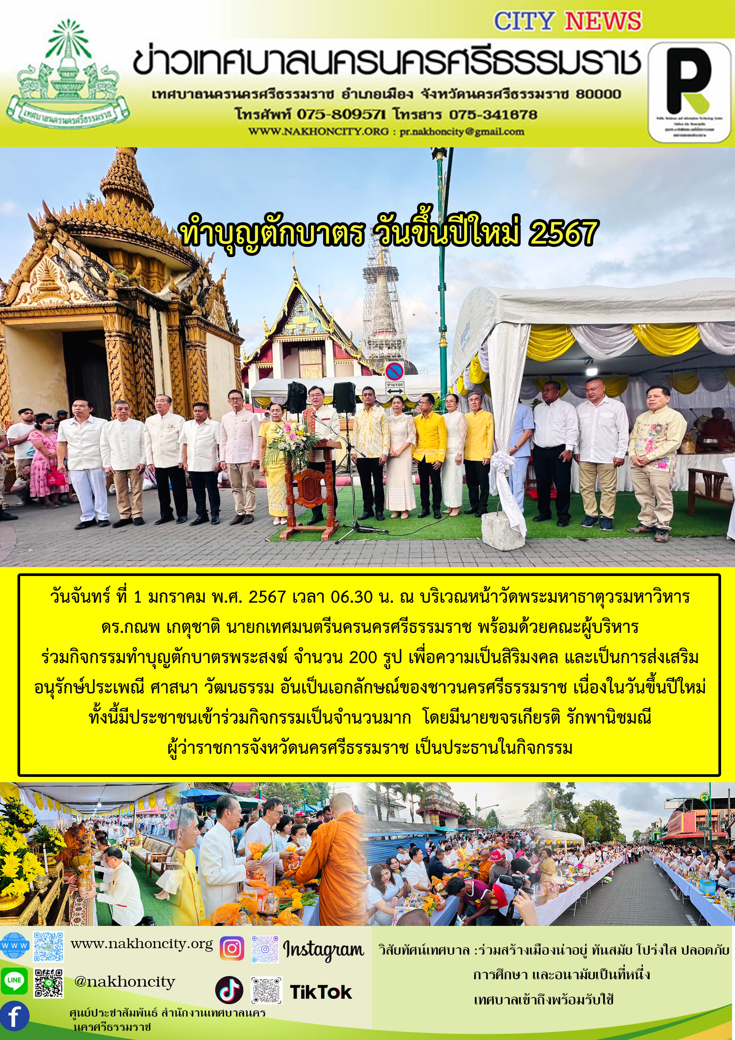 ดร. กณพ เกตุชาติ นายกเทศมนตรีนครนครศรีธรรมราช พร้อมด้วยคณะผู้บริหาร ร่วมกิจกรรมทำบุญตักบาตรพระสงฆ์ จำนวน 200 รูป เพื่อความเป็นสิริมงคล และเป็นการส่งเสริม อนุรักษ์ประเพณี ศาสนา วัฒนธรรม อันเป็นเอกลักษณ์ของชาวนครศรีธรรมราช เนื่องในวันขึ้นปีใหม่ |
