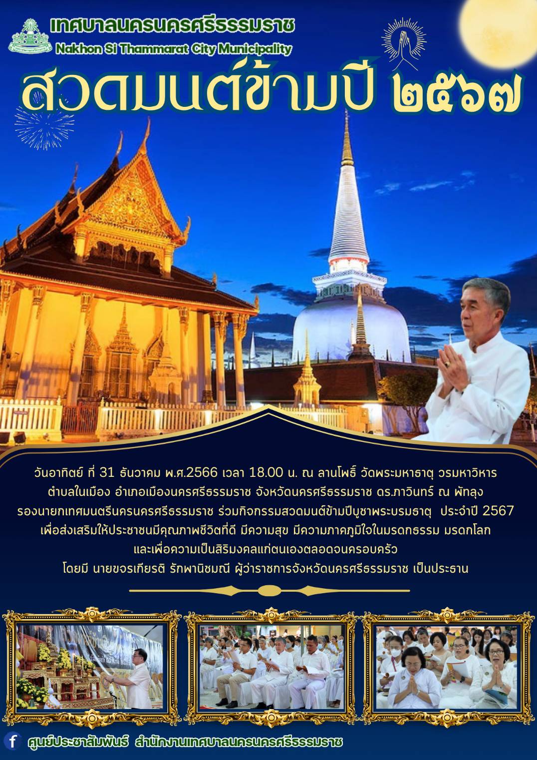 วันอาทิตย์ ที่ 31 ธันวาคม พ.ศ.2566 เวลา 18.00 น. ณ ลานโพธิ์ วัดพระมหาธาตุ วรมหาวิหาร ตำบลในเมือง อำเภอเมืองนครศรีธรรมราช จังหวัดนครศรีธรรมราช ดร.ภาวินทร์ ณ พัทลุง รองนายกเทศมนตรีนครนครศรีธรรมราช ร่วมกิจกรรมสวดมนต์ข้ามปีบูชาพระบรมธาตุ ประจำปี 2567 เพื่อส่งเสริมให้ประชาชนมีคุณภาพชีวิตที่ดี มีความสุข มีความภาคภูมิใจในมรดกธรรม มรดกโลก และเพื่อความเป็นสิริมงคลแก่ตนเองตลอดจนครอบครัว โดยมี นายขจรเกียรติ รักพานิชมณี ผู้ว่าราชการจังหวัดนครศรีธรรมราช เป็นประธาน …………… ภาพ//ข่าว//จันทร์จิรา |