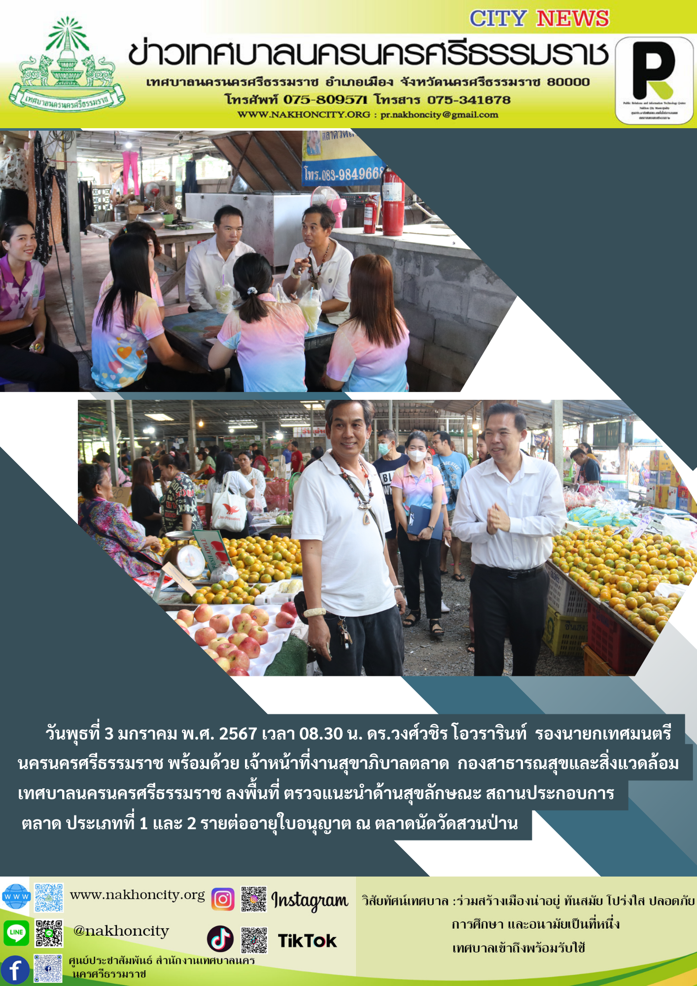 ดร.วงศ์วชิร โอวรารินท์ รองนายกเทศมนตรีนครนครศรีธรรมราช พร้อมด้วย เจ้าหน้าที่งานสุขาภิบาลตลาด กองสาธารณสุขและสิ่งแวดล้อมเทศบาลนครนครศรีธรรมราช ลงพื้นที่ ตรวจแนะนำด้านสุขลักษณะ สถานประกอบการ ตลาด ประเภทที่ 1 และ 2 รายต่ออายุใบอนุญาต ณ ตลาดนัดวัดสวนป่าน |