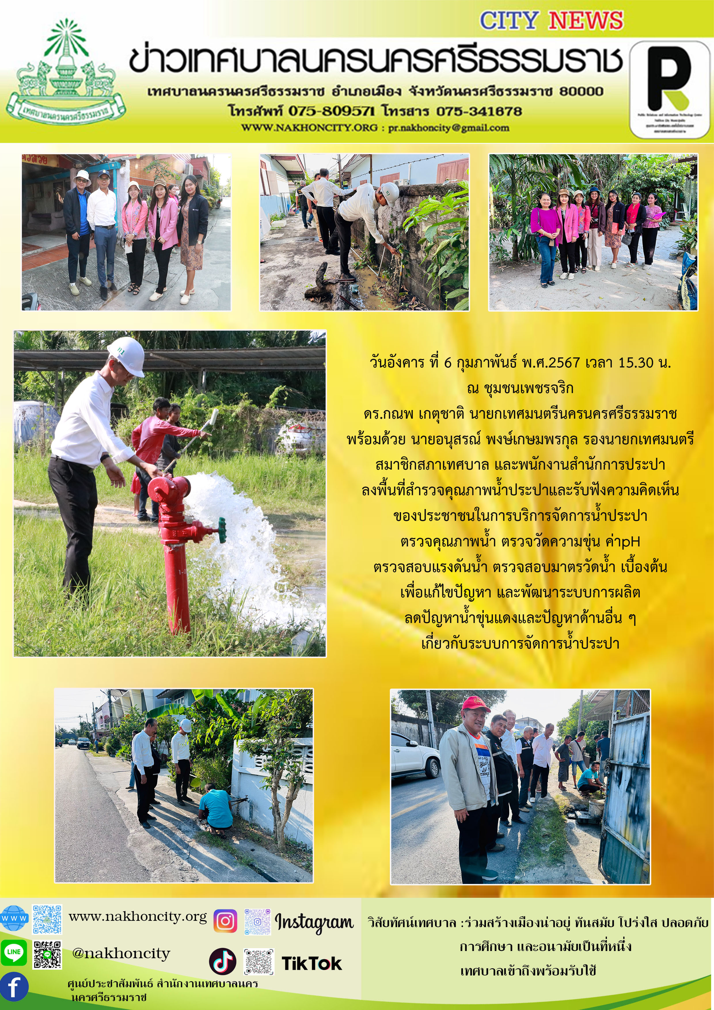 ดร.กณพ เกตุชาติ นายกเทศมนตรีนครนครศรีธรรมราช ลงพื้นที่ สำรวจคุณภาพน้ำประปาและรับฟังความคิดเห็นของประชาชนในการบริการจัดการน้ำประปา |