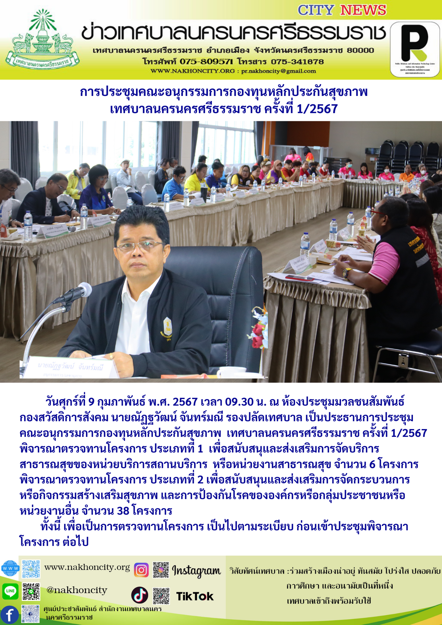 วันศุกร์ที่ 9 กุมภาพันธ์ พ.ศ. 2567 เวลา 09.30 น. ณ ห้องประชุมมวลชนสัมพันธ์ กองสวัสดิการสังคม นายณัฏฐวัฒน์ จันทร์มณี รองปลัดเทศบาล เป็นประธานการประชุมคณะอนุกรรมการกองทุนหลักประกันสุขภาพ เทศบาลนครนครศรีธรรมราช ครั้งที่ 1/2567 พิจารณาตรวจทานโครงการ ประเภทที่ 1 เพื่อสนับสนุและส่งเสริมการจัดบริการสาธารณสุขของหน่วยบริการสถานบริการ หรือหน่วยงานสาธารณสุข จำนวน 6 โครงการ พิจารณาตรวจทานโครงการ ประเภทที่ 2 เพื่อสนับสนุนและส่งเสริมการจัดกระบวนการหรือกิจกรรมสร้างเสริมสุขภาพ และการป้องกันโรคขององค์กรหรือกลุ่มประชาชนหรือหน่วยงานอื่น จำนวน 38 โครงการ ทั้งนี้ เพื่อเป็นการตรวจทานโครงการ เป็นไปตามระเบียบ ก่อนเข้าประชุมพิจารณาโครงการ ต่อไป