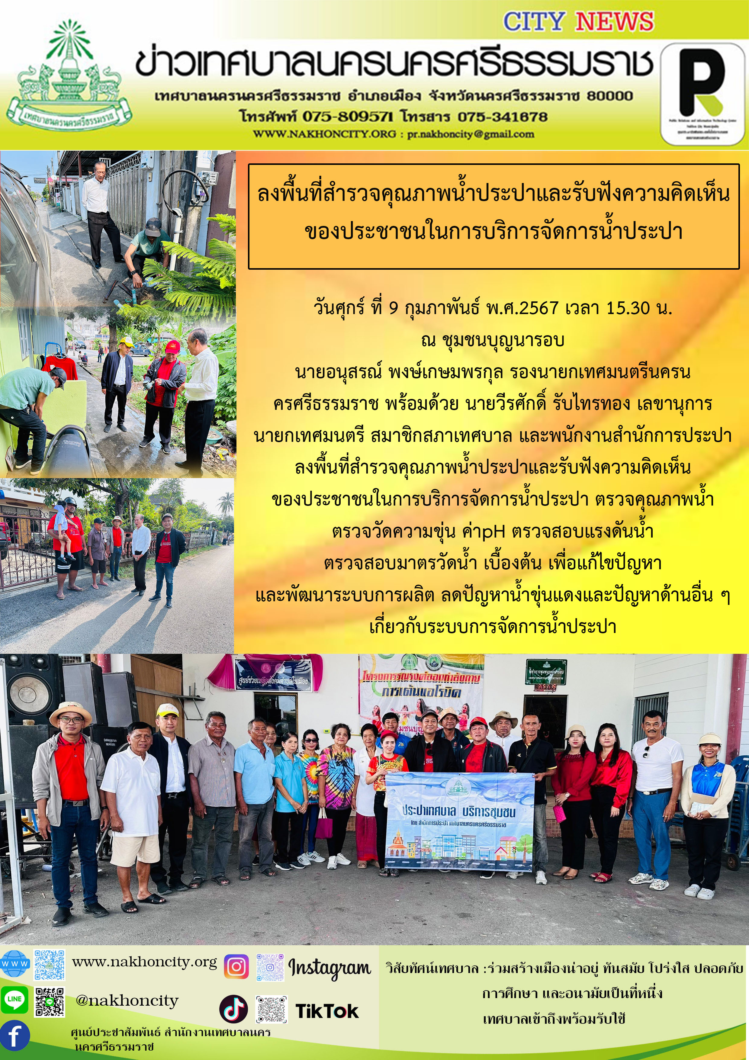นายอนุสรณ์ พงษ์เกษมพรกุล รองนายกเทศมนตรีนครนครศรีธรรมราชลงพื้นที่สำรวจคุณภาพน้ำประปาและรับฟังความคิดเห็น ของประชาชนในการบริการจัดการน้ำประปา |