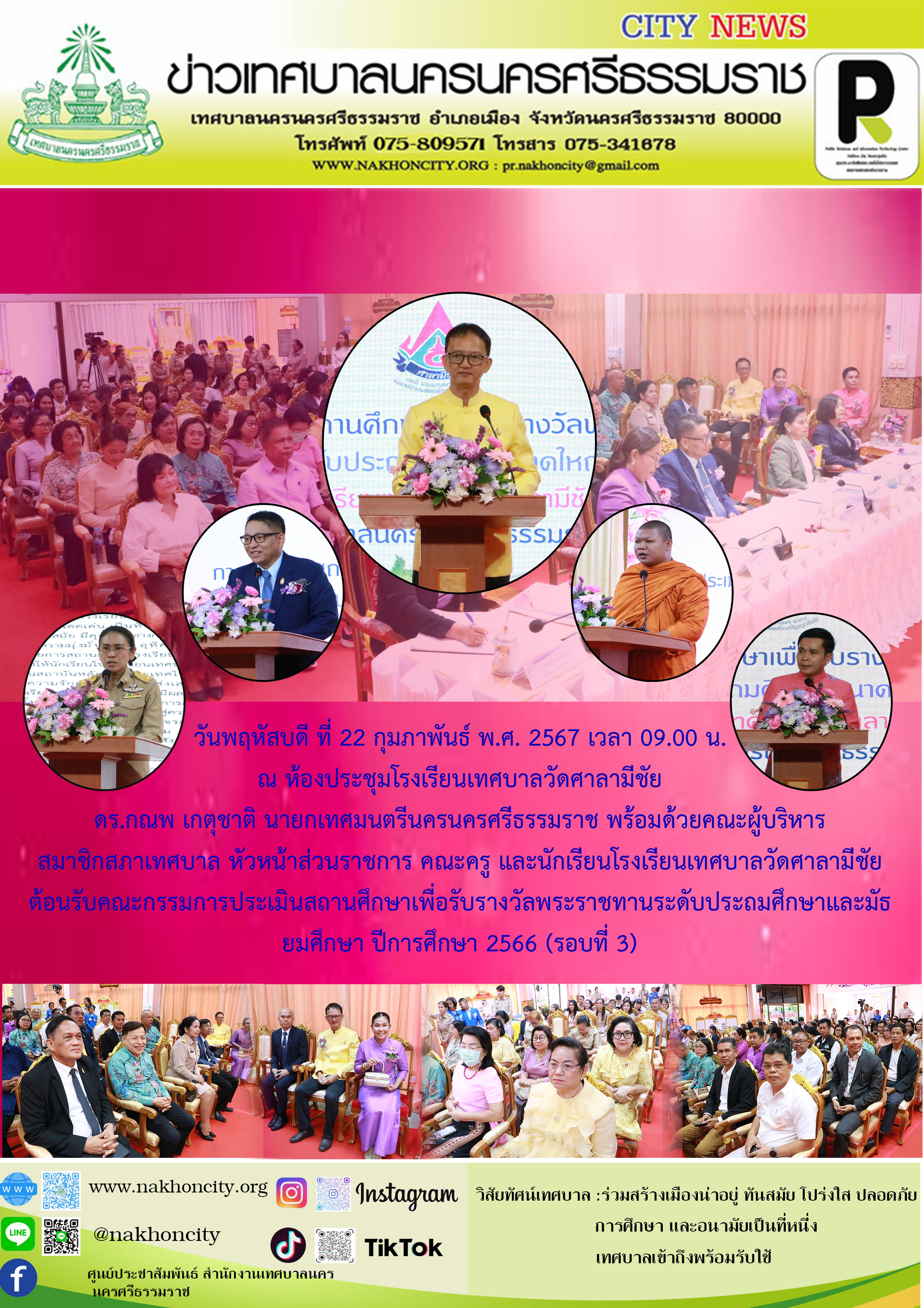 ดร.กณพ เกตุชาติ นายกเทศมนตรีนครนครศรีธรรมราช พร้อมด้วยคณะผู้บริหาร สมาชิกสภาเทศบาล หัวหน้าส่วนราชการ คณะครู และนักเรียนโรงเรียนเทศบาลวัดศาลามีชัย ต้อนรับคณะกรรมการประเมินสถานศึกษาเพื่อรับรางวัลพระราชทานระดับประถมศึกษาและมัธยมศึกษา ปีการศึกษา 2566 (รอบที่ 3) |