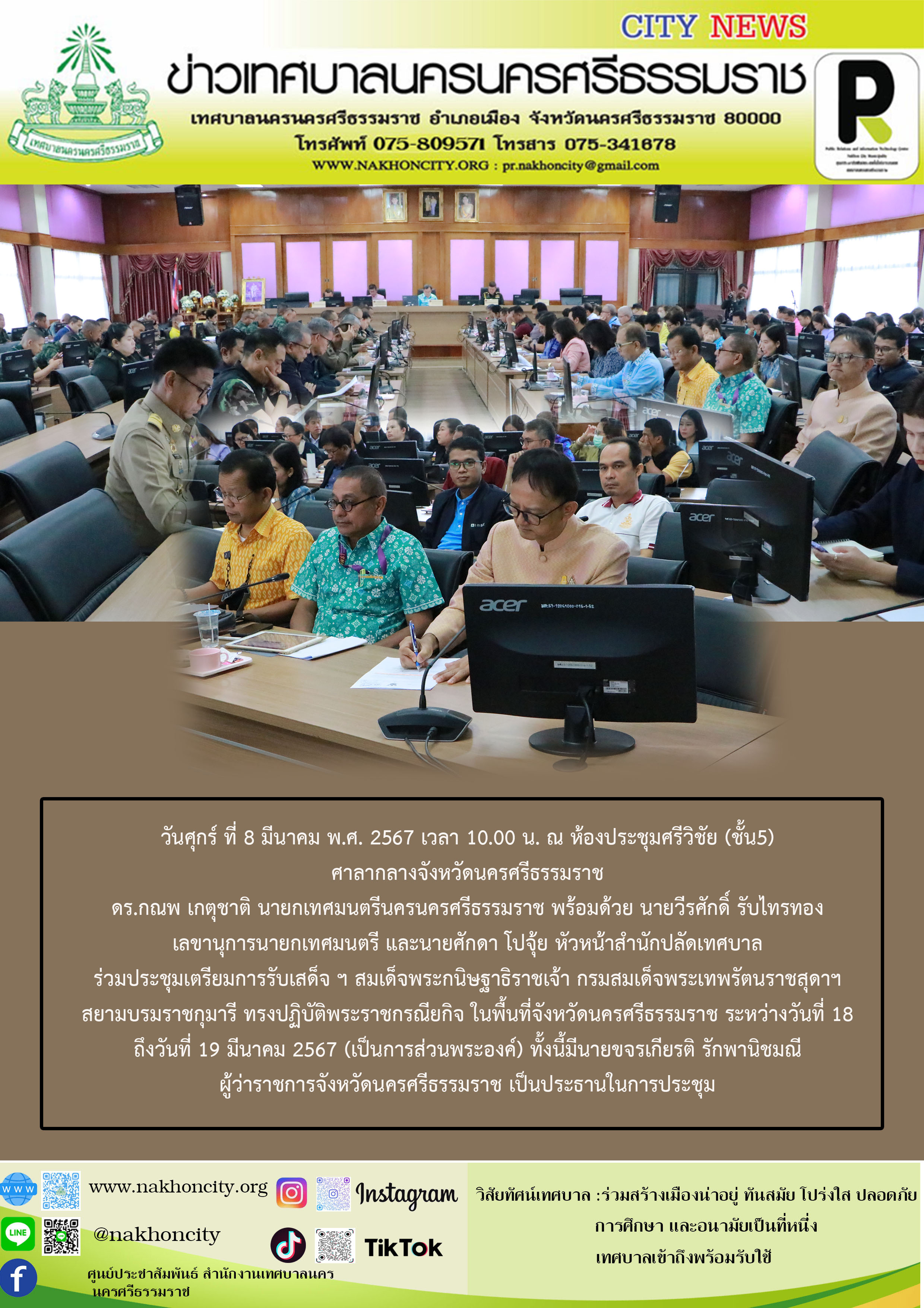 | วันศุกร์ ที่ 8 มีนาคม พ.ศ. 2567 เวลา 10.00 น. ณ ห้องประชุมศรีวิชัย (ชั้น5) ศาลากลางจังหวัดนครศรีธรรมราช