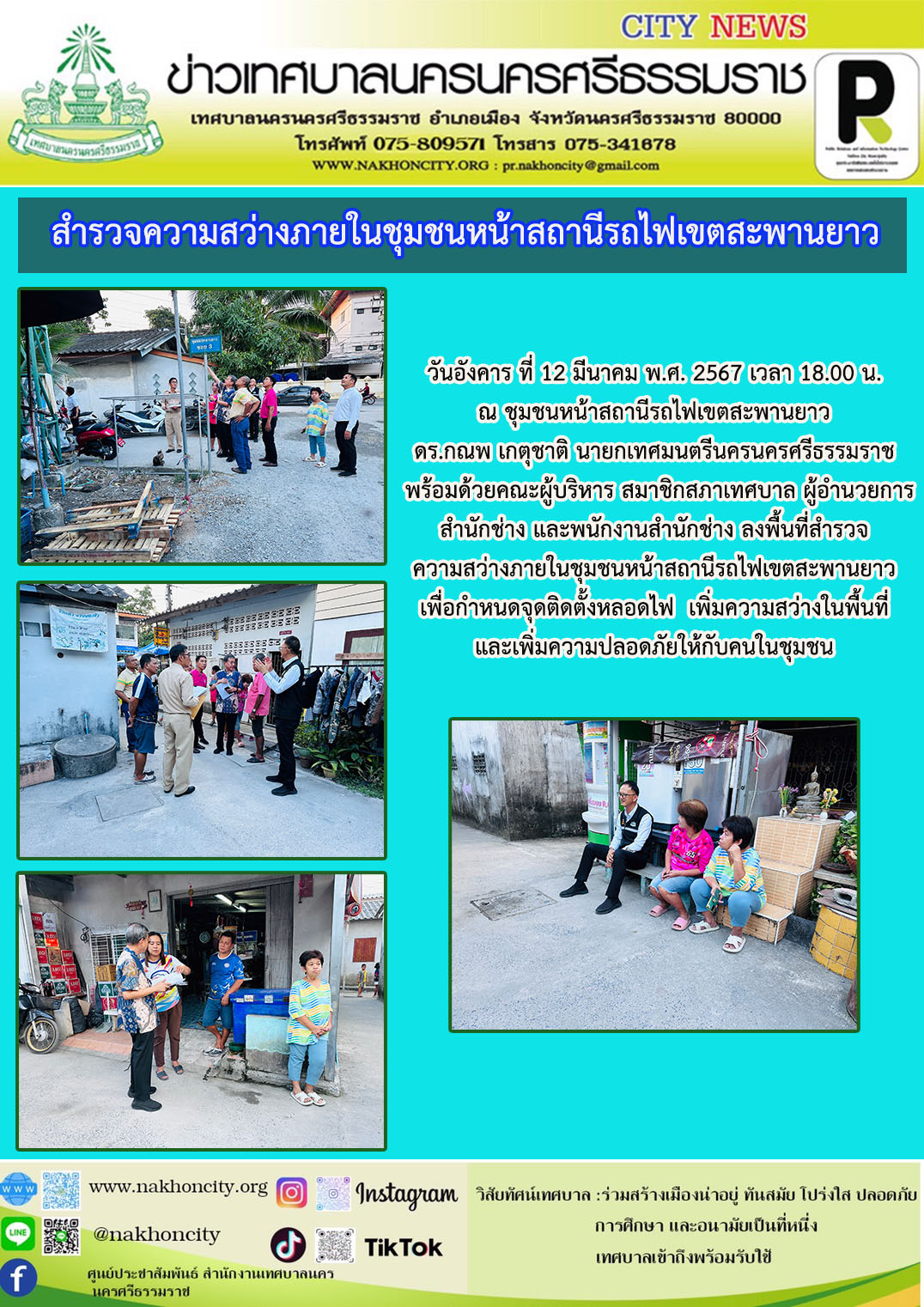 ดร.กณพ เกตุชาติ นายกเทศมนตรีนครนครศรีธรรมราช พร้อมด้วยคณะผู้บริหาร สมาชิกสภาเทศบาล ผู้อำนวยการสำนักช่าง และพนักงานสำนักช่าง ลงพื้นที่สำรวจความสว่างภายในชุมชนหน้าสถานีรถไฟเขตสะพานยาว เพื่อกำหนดจุดติดตั้งหลอดไฟ  เพิ่มความสว่างในพื้นที่ และเพิ่มความปลอดภัยให้กับคนในชุมชน