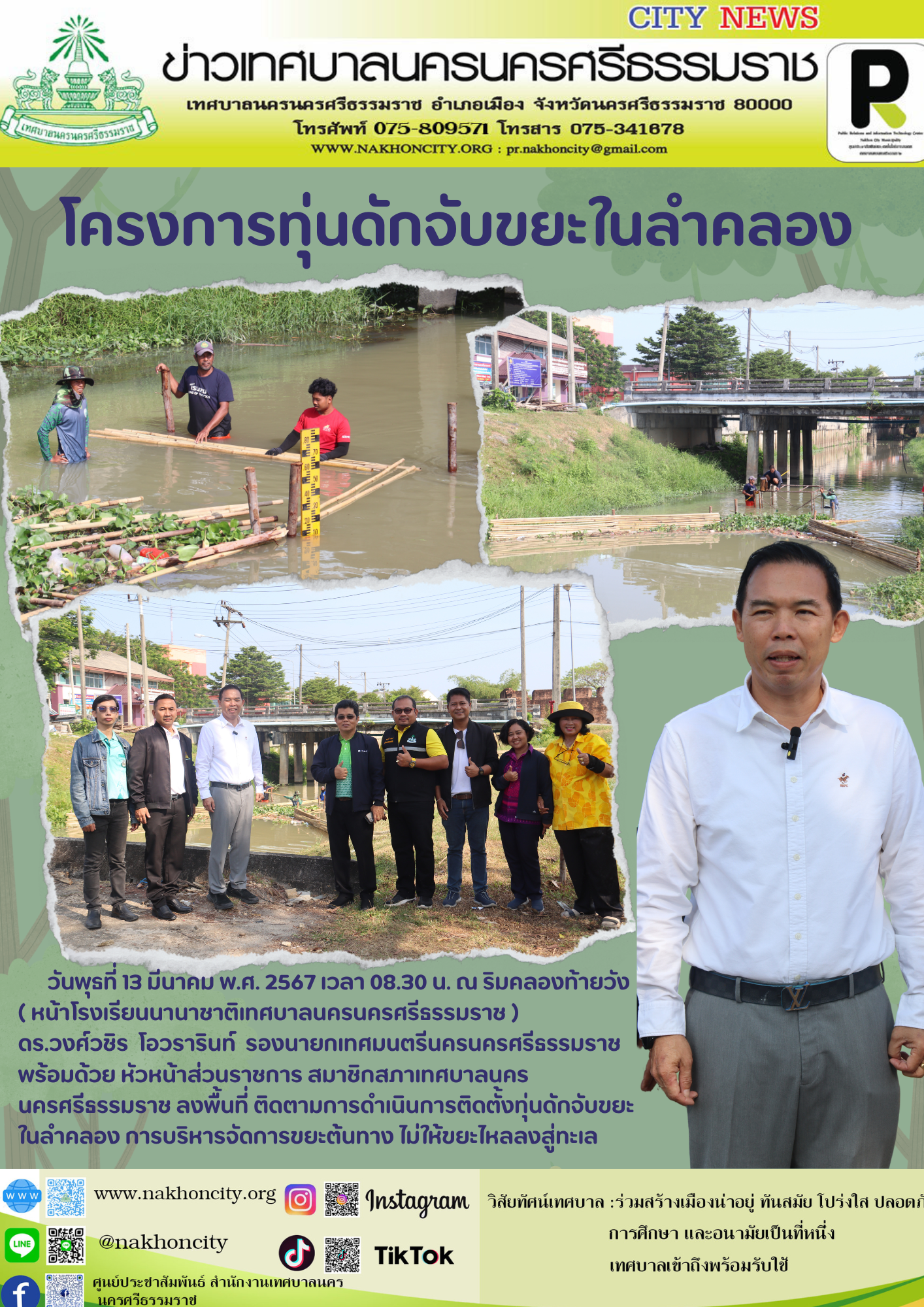 วันพุธที่ 13 มีนาคม พ.ศ. 2567 เวลา 08.30 น. ณ ริมคลองท้ายวัง ( หน้าโรงเรียนนานาชาติเทศบาลนครนครศรีธรรมราช ) ดร.วงศ์วชิร  โอวรารินท์  รองนายกเทศมนตรีนครนครศรีธรรมราช พร้อมด้วย หัวหน้าส่วนราชการ สมาชิกสภาเทศบาลนครนครศรีธรรมราช ลงพื้นที่ ติดตามการดำเนินการติดตั้งทุ่นดักจับขยะในลำคลอง การบริหารจัดการขยะต้นทาง ไม่ให้ขยะไหลลงสู่ทะเล
