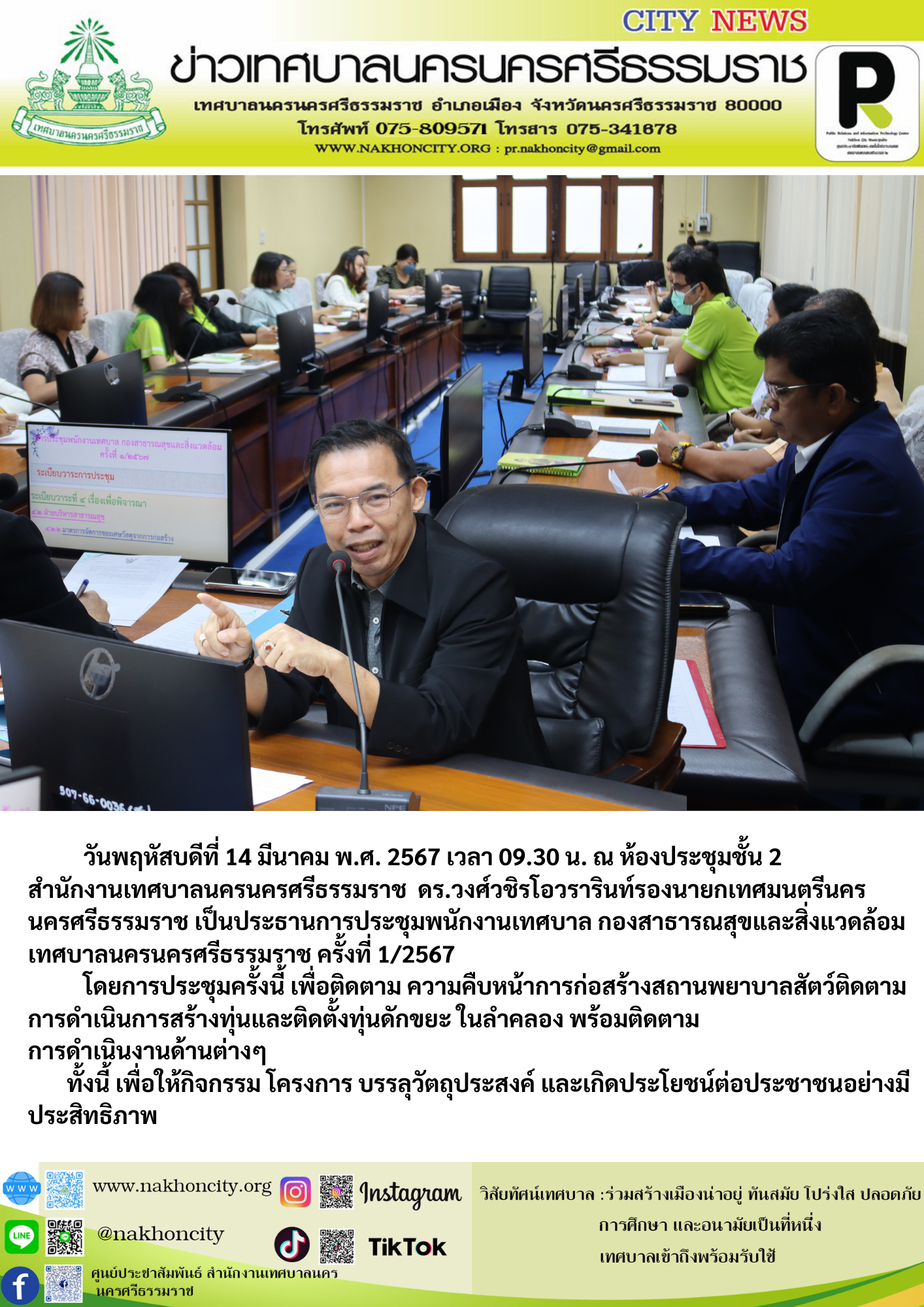 วันพฤหัสบดีที่ 14 มีนาคม พ.ศ. 2567 เวลา 09.30 น. ณ ห้องประชุมชั้น 2 สำนักงานเทศบาลนครนครศรีธรรมราช ดร.วงศ์วชิร โอวรารินท์ รองนายกเทศมนตรีนครนครศรีธรรมราช เป็นประธานการประชุมพนักงานเทศบาล กองสาธารณสุขและสิ่งแวดล้อม เทศบาลนครนครศรีธรรมราช ครั้งที่ 1/2567 โดยการประชุมครั้งนี้ เพื่อติดตาม ความคืบหน้าการก่อสร้างสถานพยาบาลสัตว์ ติดตามการดำเนินการสร้างทุ่นและติดตั้งทุ่นดักขยะ ในลำคลอง พร้อมติดตามการดำเนินงานด้านต่างๆ ทั้งนี้ เพื่อให้กิจกรรม โครงการ บรรลุวัตถุประสงค์ และเกิดประโยชน์ต่อประชาชนอย่างมีประสิทธิภาพ |