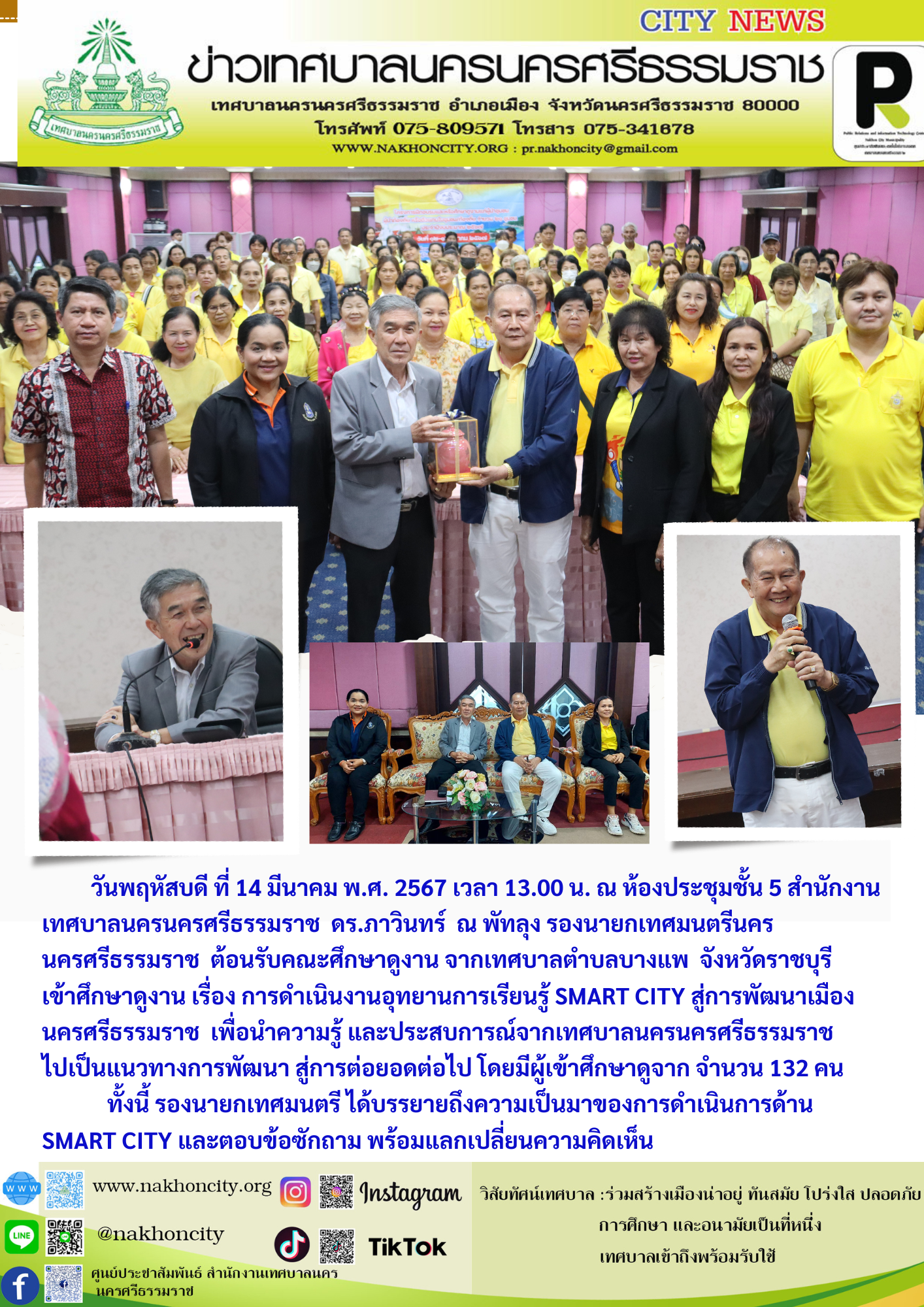 ดร.ภาวินทร์ ณ พัทลุง รองนายกเทศมนตรีนครนครศรีธรรมราช ต้อนรับคณะศึกษาดูงาน จากเทศบาลตำบลบางแพ จังหวัดราชบุรี เข้าศึกษาดูงาน เรื่อง การดำเนินงานอุทยานการเรียนรู้ SMART CITY สู่การพัฒนาเมืองนครศรีธรรมราช |