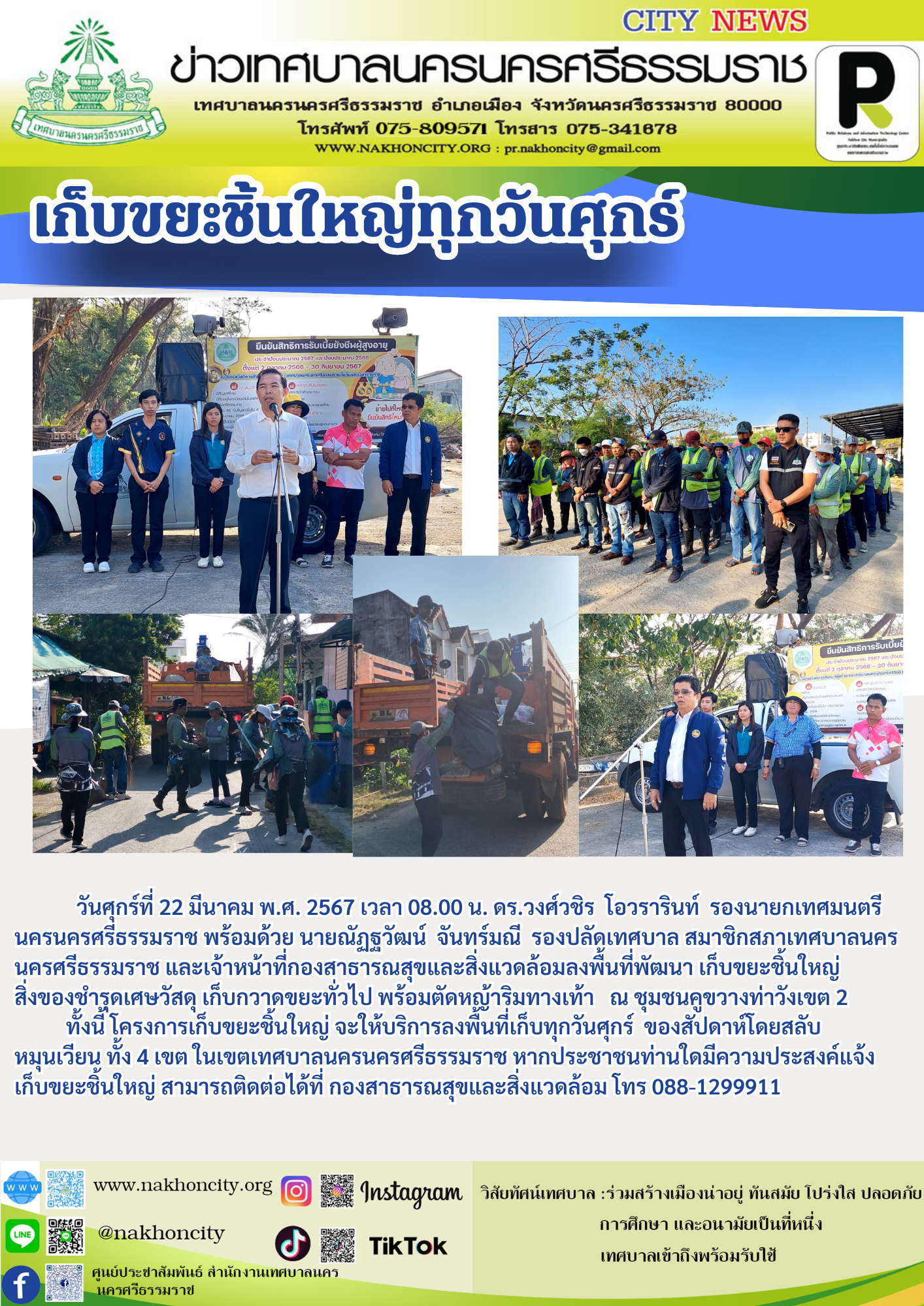 วันศุกร์ที่ 22 มีนาคม พ.ศ. 2567 เวลา 08.00 น. ดร.วงศ์วชิร โอวรารินท์ รองนายกเทศมนตรีนครนครศรีธรรมราช พร้อมด้วย นายณัฏฐวัฒน์ จันทร์มณี รองปลัดเทศบาล สมาชิกสภาเทศบาลนครนครศรีธรรมราช และเจ้าหน้าที่กองสาธารณสุขและสิ่งแวดล้อมลงพื้นที่พัฒนา เก็บขยะชิ้นใหญ่ สิ่งของชำรุดเศษวัสดุ เก็บกวาดขยะทั่วไป พร้อมตัดหญ้าริมทางเท้า ณ ชุมชนคูขวางท่าวังเขต 2 |