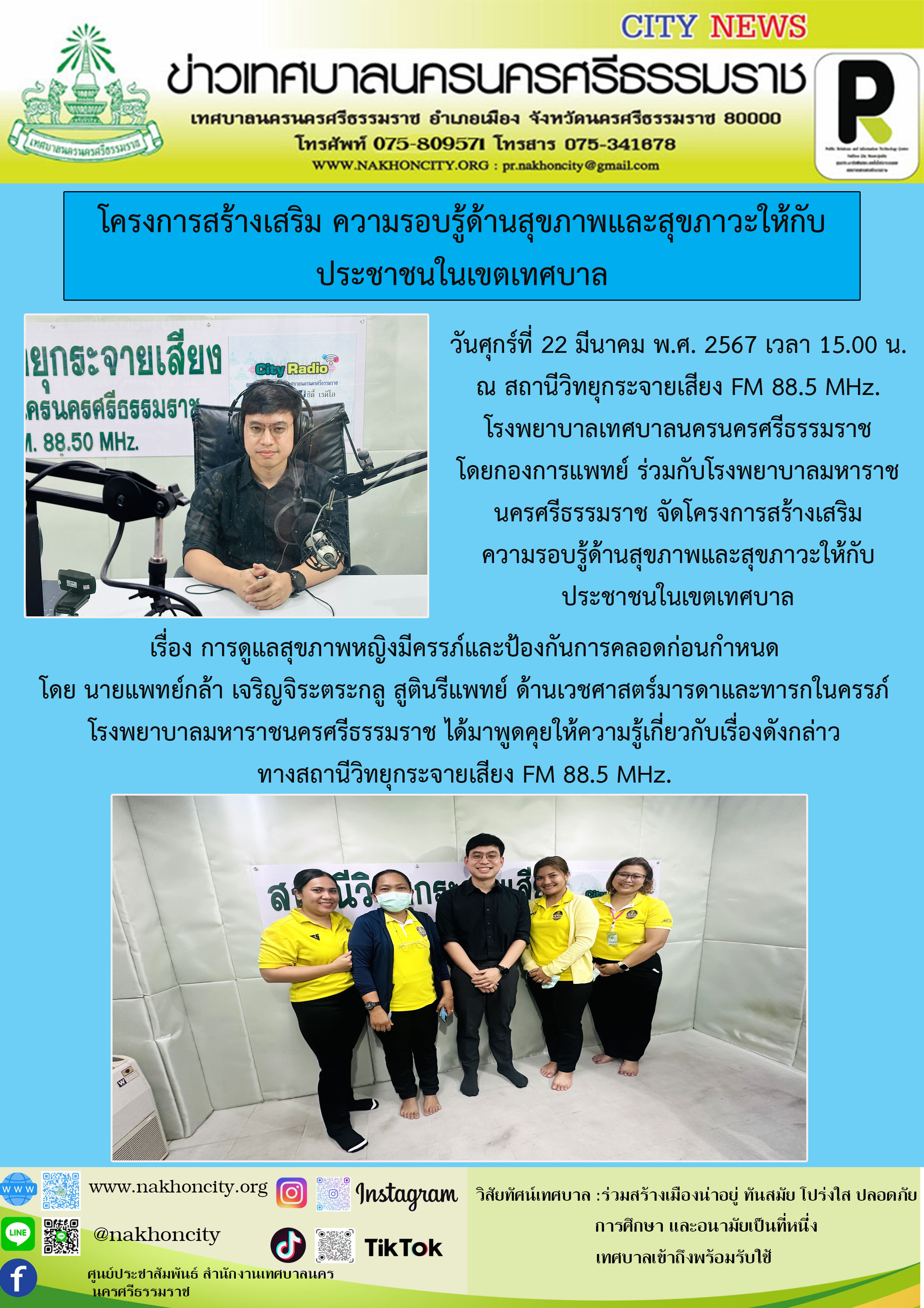 โรงพยาบาลเทศบาลนครนครศรีธรรมราช โดยกองการแพทย์ ร่วมกับโรงพยาบาลมหาราชนครศรีธรรมราช จัดโครงการสร้างเสริมความรอบรู้ด้านสุขภาพและสุขภาวะให้กับประชาชนในเขตเทศบาล เรื่อง การดูแลสุขภาพหญิงมีครรภ์และป้องกันการคลอดก่อนกำหนด |