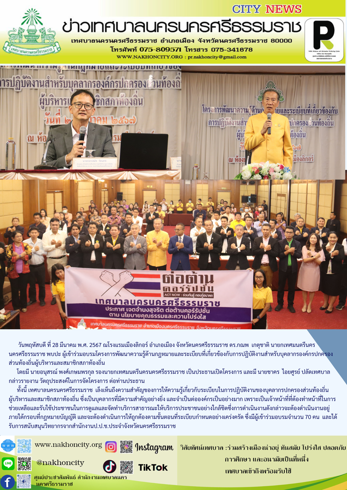 ดร.กณพ เกตุชาติ นายกเทศมนตรีนครนครศรีธรรมราช พบปะ ผู้เข้าร่วมอบรมโครงการพัฒนาความรู้ด้านกฎหมายและระเบียบที่เกี่ยวข้องกับการปฎิบัติงานสำหรับบุคลากรองค์กรปกครองส่วนท้องถิ่นผู้บริหารและสมาชิกสภาท้องถิ่น |