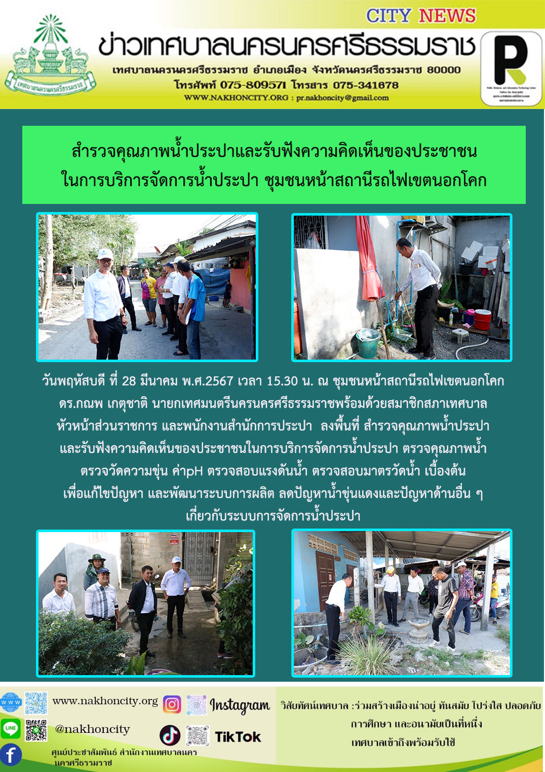 ดร.กณพ เกตุชาติ นายกเทศมนตรีนครนครศรีธรรมราชพร้อมด้วยสมาชิกสภาเทศบาล หัวหน้าส่วนราชการ และพนักงานสำนักการประปา ลงพื้นที่ สำรวจคุณภาพน้ำประปาและรับฟังความคิดเห็นของประชาชนในการบริการจัดการน้ำประปา |