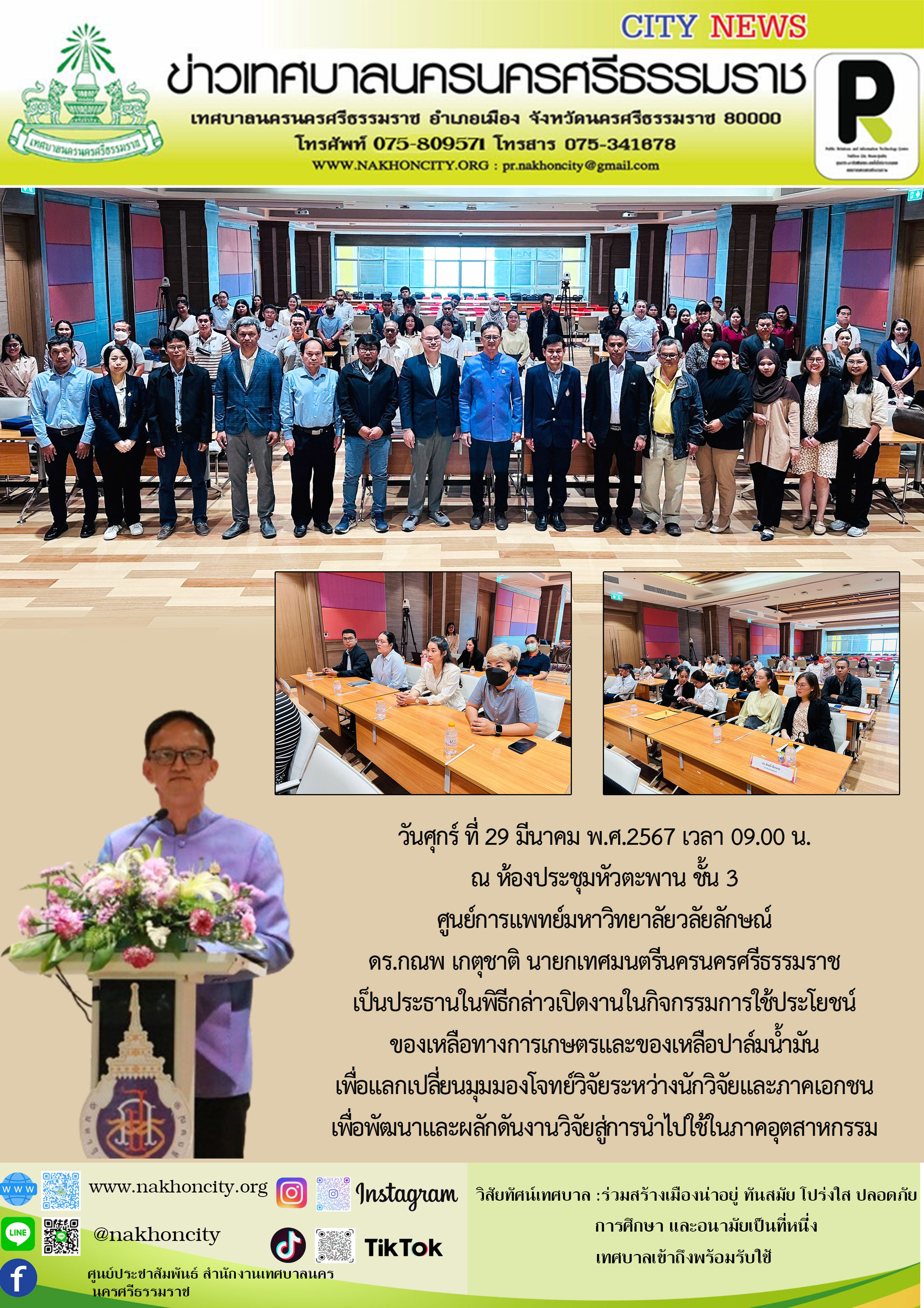 ดร.กณพ เกตุชาติ นายกเทศมนตรีนครนครศรีธรรมราชเป็นประธานในพิธีกล่าวเปิดงานในกิจกรรมการใช้ประโยชน์ของเหลือทางการเกษตรและของเหลือปาล์มน้ำมัน |