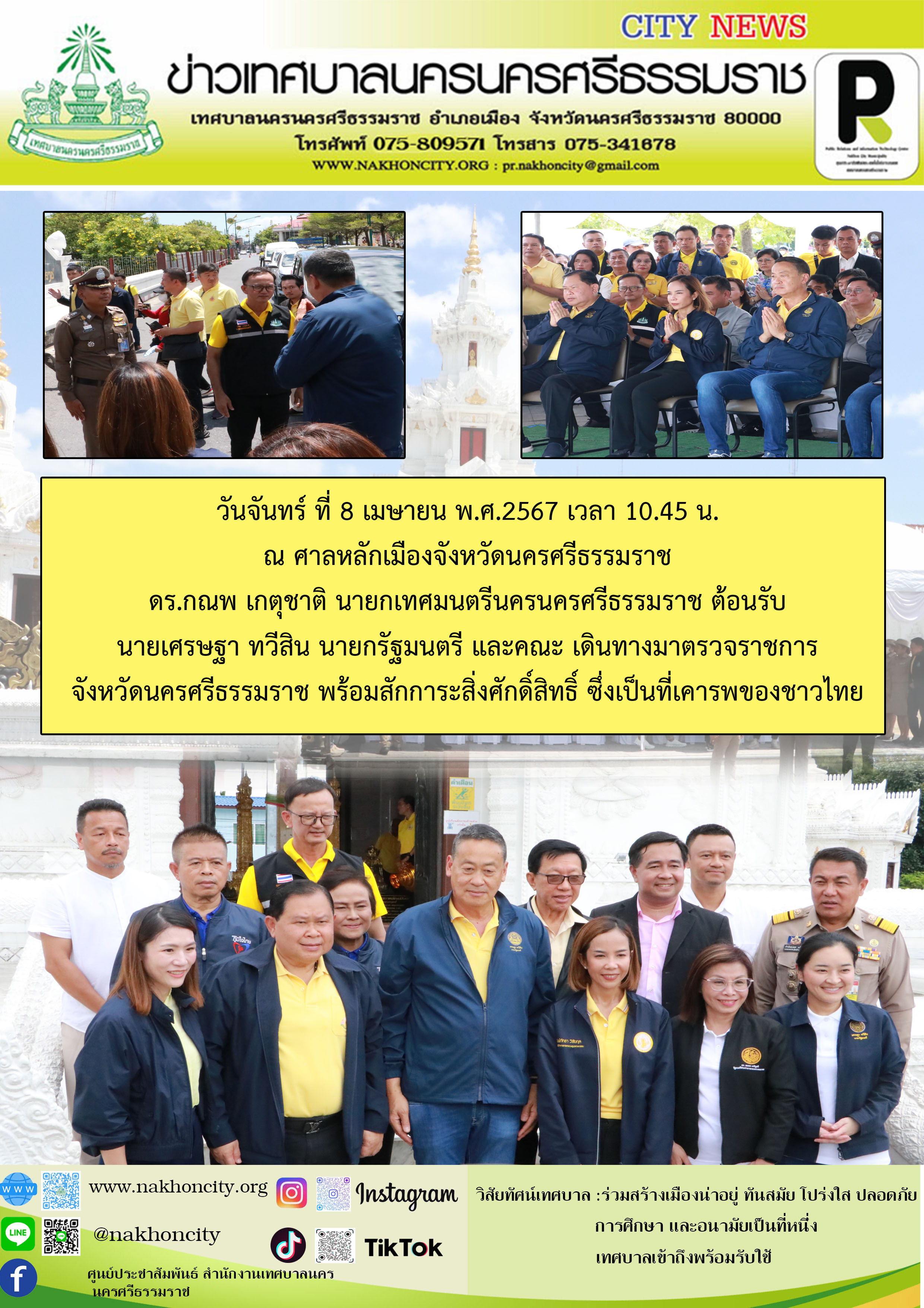 ดร.กณพ เกตุชาติ นายกเทศมนตรีนครนครศรีธรรมราช ต้อนรับนายเศรษฐา ทวีสิน นายกรัฐมนตรี และคณะ เดินทางมาตรวจราชการ จังหวัดนครศรีธรรมราช พร้อมสักการะสิ่งศักดิ์สิทธิ์ ซึ่งเป็นที่เคารพของชาวไทย