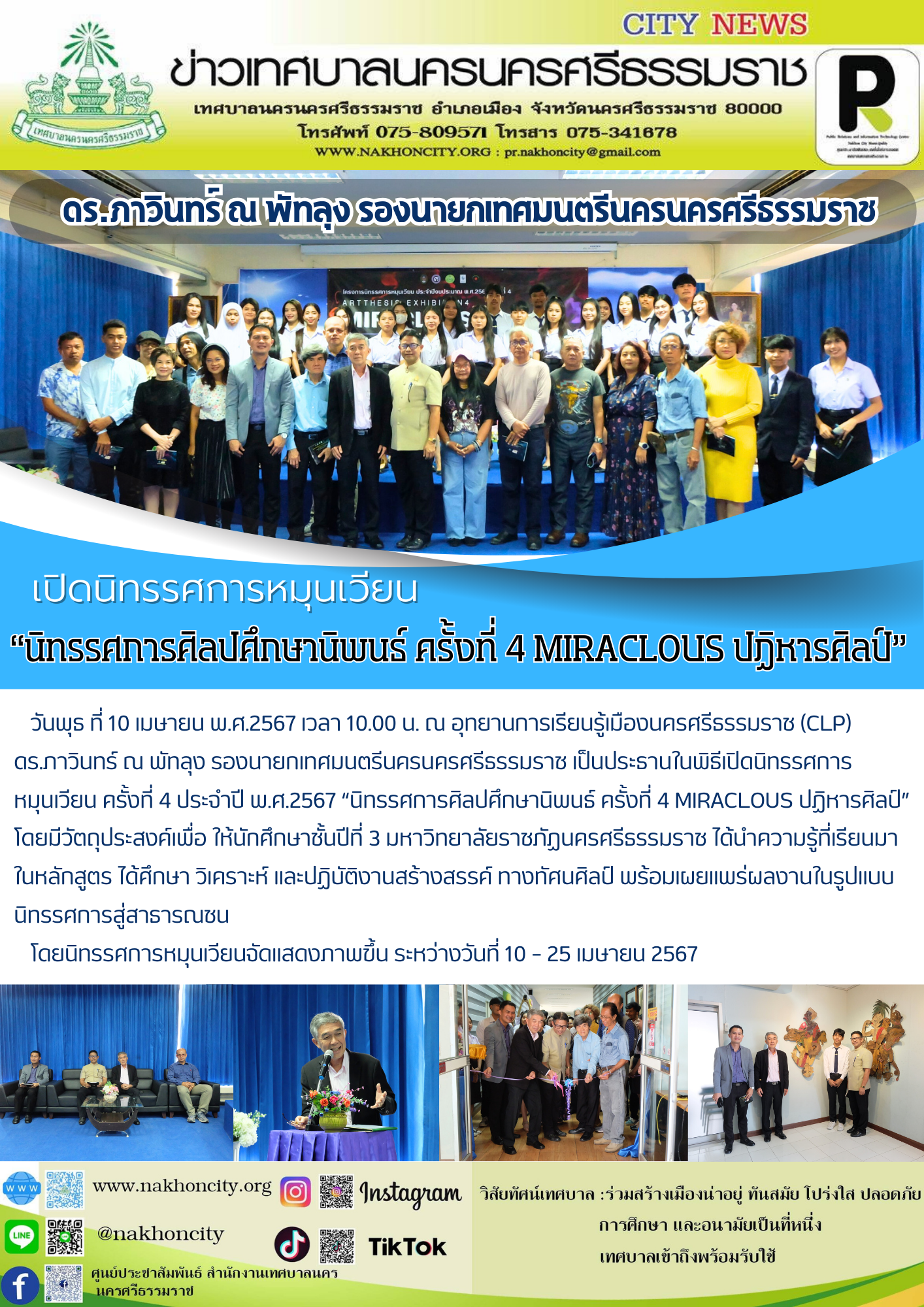 ดร.ภาวินทร์ ณ พัทลุง รองนายกเทศมนตรีนครนครศรีธรรมราช เป็นประธานในพิธีเปิดนิทรรศการหมุนเวียน ครั้งที่ 4 ประจำปี พ.ศ.2567 “นิทรรศการศิลปศึกษานิพนธ์ ครั้งที่ 4 MIRACLOUS ปฏิหารศิลป์” |