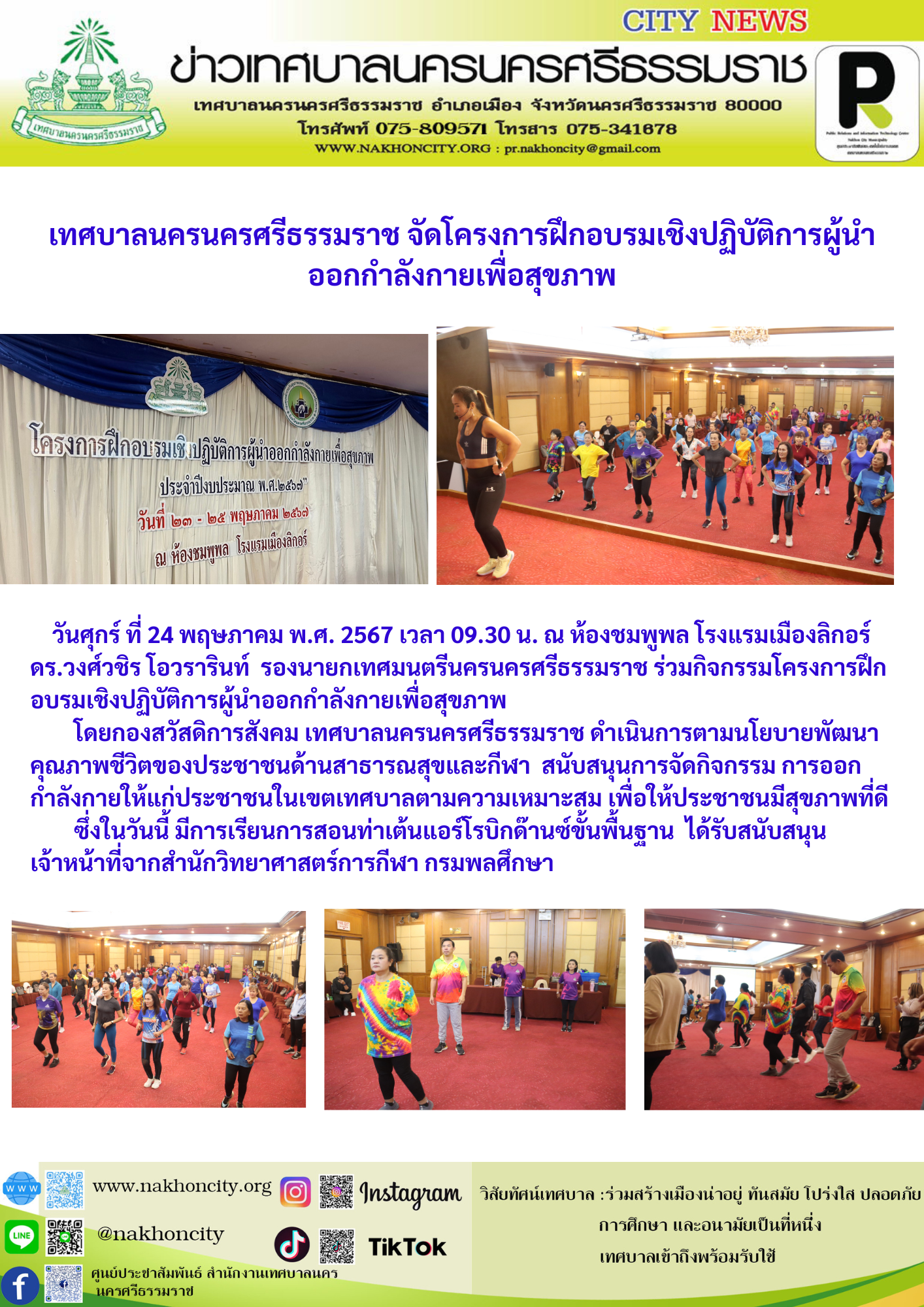 เทศบาลนครนครศรีธรรมราช จัดกิจกรรมโครงการฝึกอบรมเชิงปฏิบัติการผู้นำออกกำลังกายเพื่อสุขภาพ |