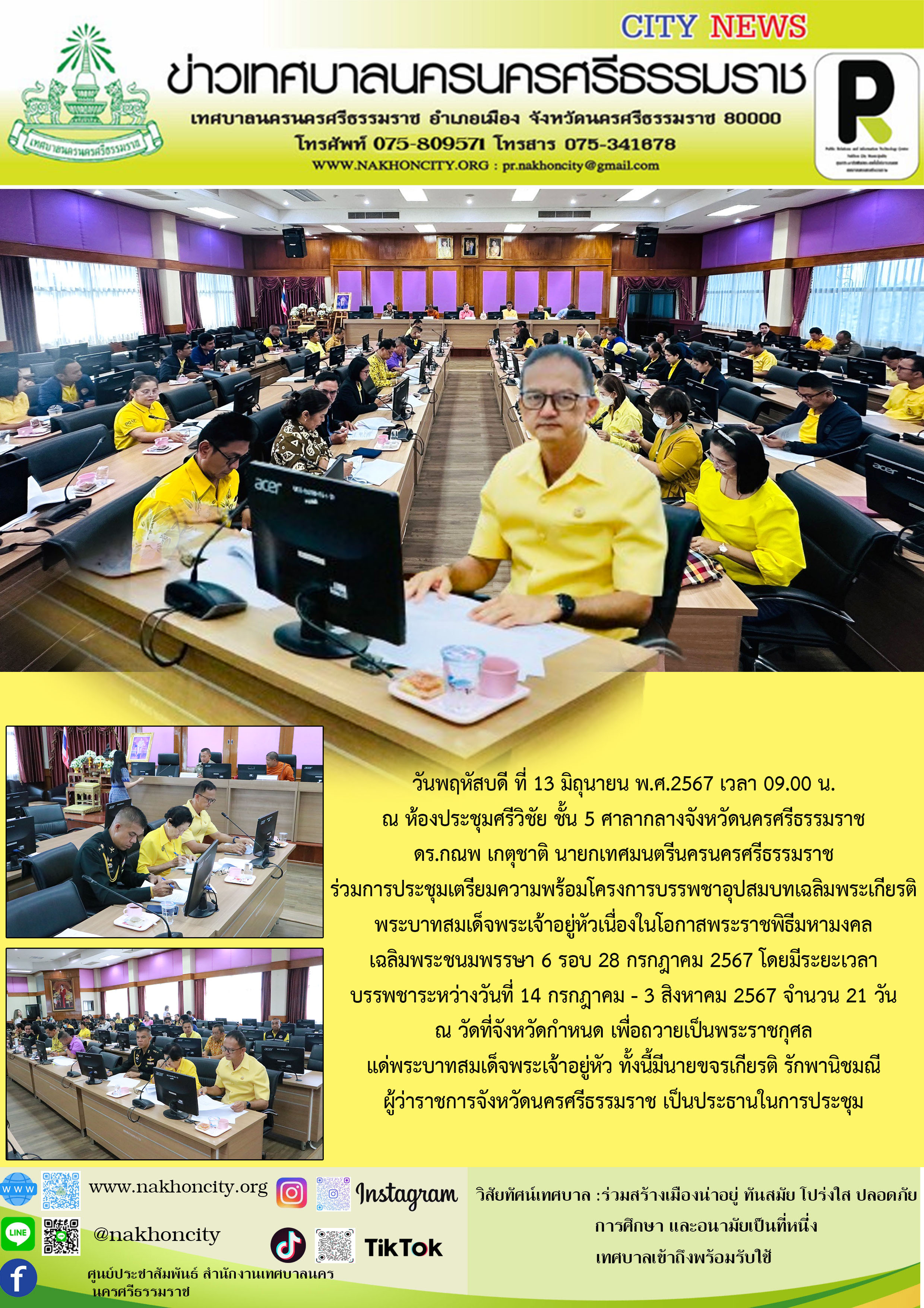 วันพฤหัสบดี ที่ 13 มิถุนายน พ.ศ.2567 เวลา 09.00 น. ณ ห้องประชุมศรีวิชัย ชั้น 5 ศาลากลางจังหวัดนครศรีธรรมราช
