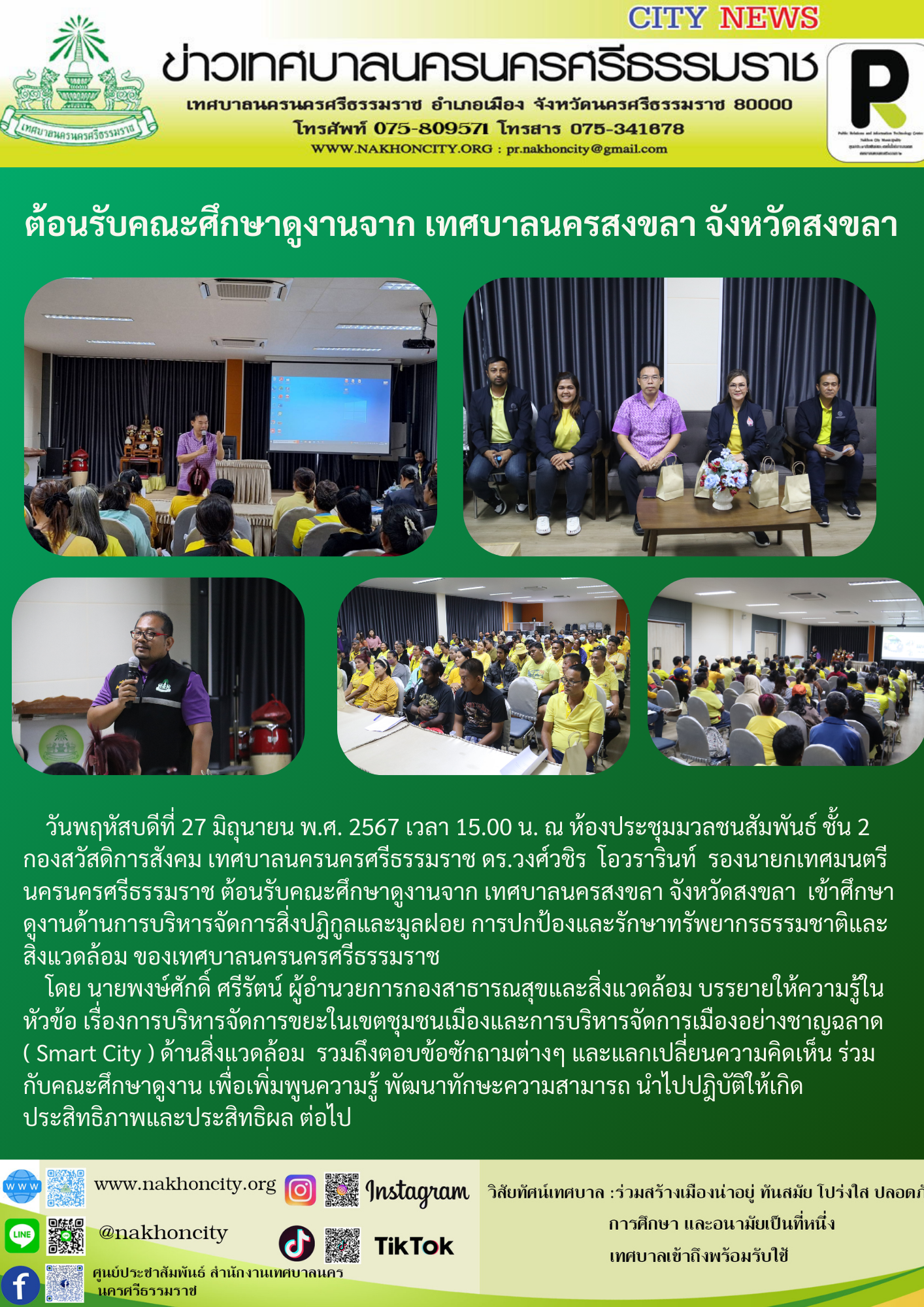 วันพฤหัสบดีที่ 27 มิถุนายน พ.ศ. 2567 เวลา 15.00 น. ณ ห้องประชุมมวลชนสัมพันธ์ ชั้น 2 กองสวัสดิการสังคม เทศบาลนครนครศรีธรรมราช ดร.วงศ์วชิร โอวรารินท์ รองนายกเทศมนตรีนครนครศรีธรรมราช ต้อนรับคณะศึกษาดูงานจาก เทศบาลนครสงขลา จังหวัดสงขลา เข้าศึกษาดูงานด้านการบริหารจัดการสิ่งปฎิกูลและมูลฝอย การปกป้องและรักษาทรัพยากรธรรมชาติและสิ่งแวดล้อม ของเทศบาลนครนครศรีธรรมราช โดย นายพงษ์ศักดิ์ ศรีรัตน์ ผู้อำนวยการกองสาธารณสุขและสิ่งแวดล้อม บรรยายให้ความรู้ในหัวข้อ เรื่องการบริหารจัดการขยะในเขตชุมชนเมืองและการบริหารจัดการเมืองอย่างชาญฉลาด ( Smart City ) ด้านสิ่งแวดล้อม รวมถึงตอบข้อซักถามต่างๆ และแลกเปลี่ยนความคิดเห็น ร่วมกับคณะศึกษาดูงาน เพื่อเพิ่มพูนความรู้ พัฒนาทักษะความสามารถ นำไปปฎิบัติให้เกิดประสิทธิภาพและประสิทธิผล ต่อไป