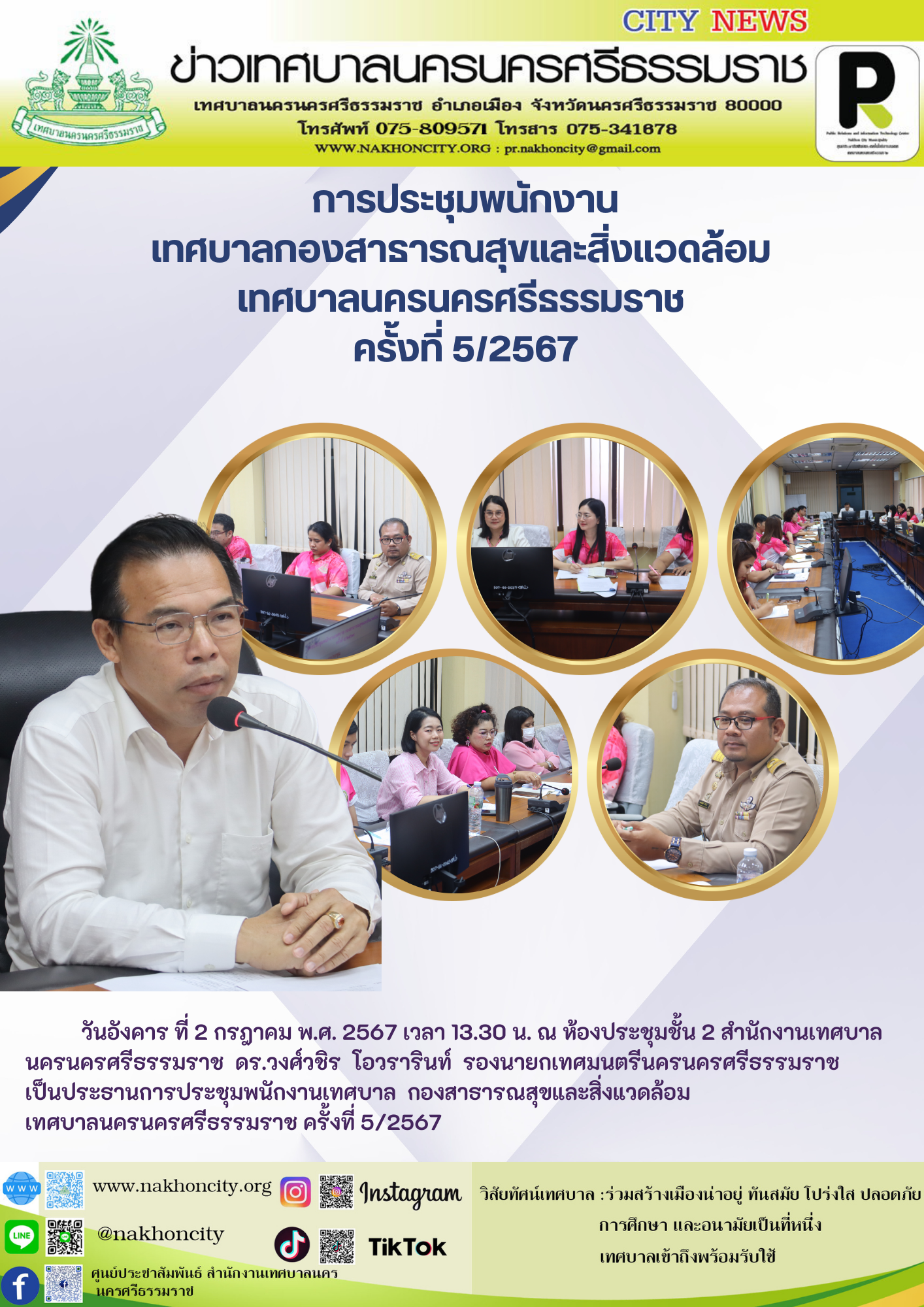 ดร.วงศ์วชิร โอวรารินท์ รองนายกเทศมนตรีนครนครศรีธรรมราช เป็นประธานการประชุมพนักงานเทศบาล กองสาธารณสุขและสิ่งแวดล้อม เทศบาลนครนครศรีธรรมราช ครั้งที่ 5/2567 |