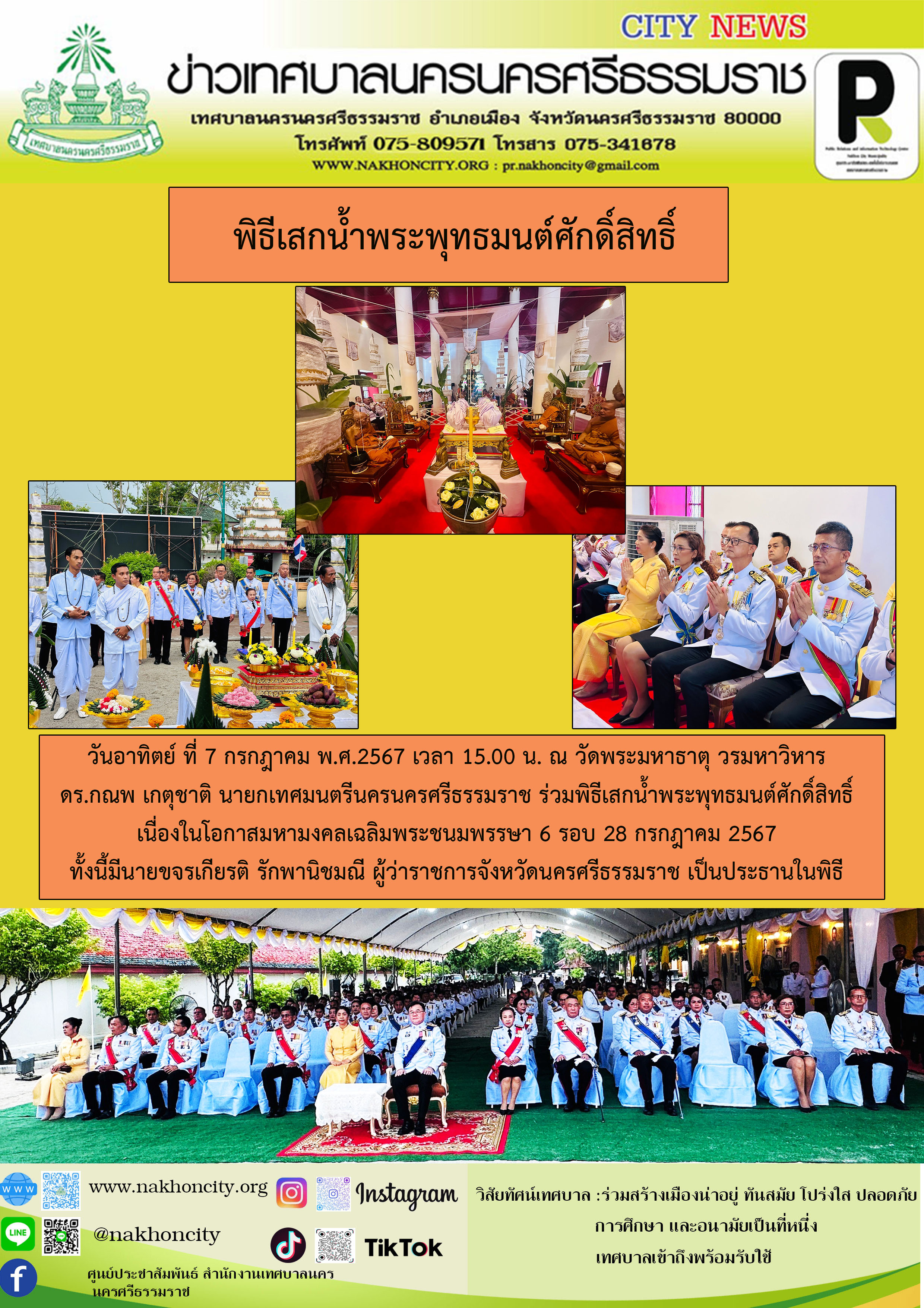 นายกเทศมนตรีนครนครศรีธรรมราช ร่วมพิธีเสกน้ำพระพุทธมนต์ศักดิ์สิทธิ์ เนื่องในโอกาสมหามงคลเฉลิมพระชนมพรรษา 6 รอบ 28 กรกฎาคม 2567 |