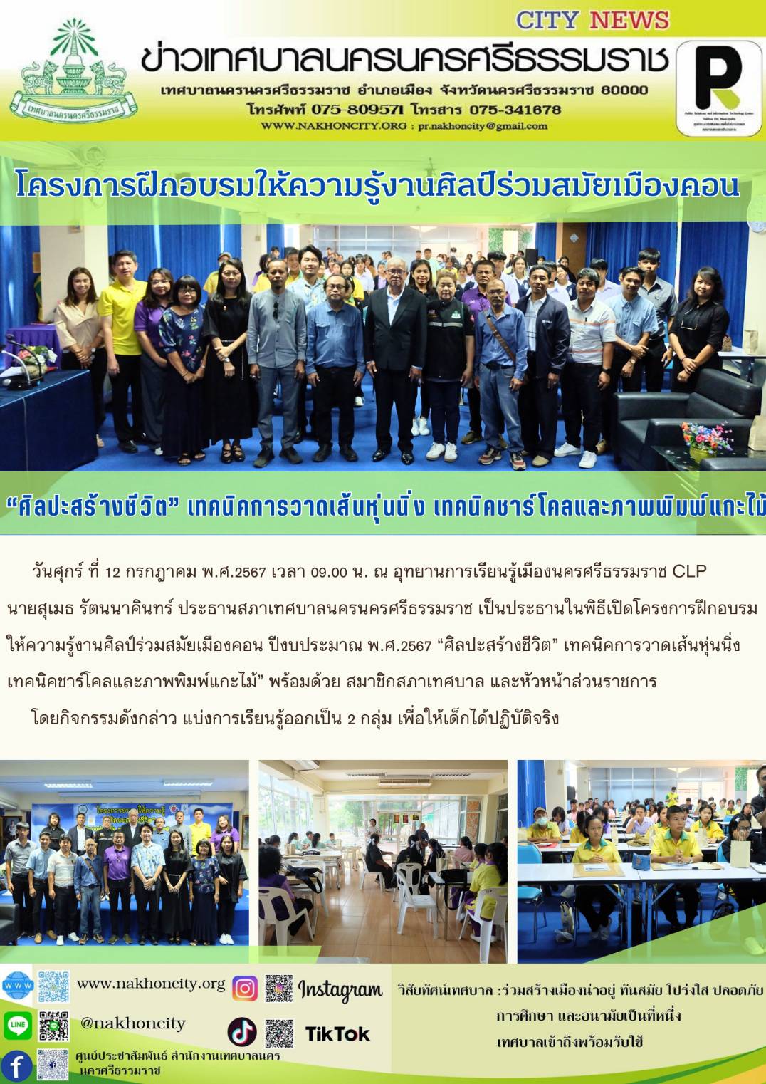 วันศุกร์ ที่ 12 กรกฎาคม พ.ศ.2567 เวลา 09.00 น. ณ อุทยานการเรียนรู้เมืองนครศรีธรรมราช CLP นายสุเมธ รัตนนาคินทร์ ประธานสภาเทศบาลนครนครศรีธรรมราช เป็นประธานในพิธีเปิดโครงการฝึกอบรมให้ความรู้งานศิลป์ร่วมสมัยเมืองคอน ปีงบประมาณ พ.ศ.2567 “ศิลปะสร้างชีวิต” เทคนิคการวาดเส้นหุ่นนิ่ง เทคนิคชาร์โคลและภาพพิมพ์แกะไม้” พร้อมด้วย สมาชิกสภาเทศบาล และหัวหน้าส่วนราชการ โดยกิจกรรมดังกล่าว แบ่งการเรียนรู้ออกเป็น 2 กลุ่ม เพื่อให้เด็กได้ปฏิบัติจริง ............ ภาพ//ข่าว//จันทร์จิรา |