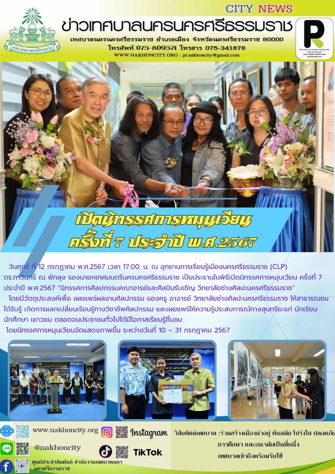 ดร.ภาวินทร์ ณ พัทลุง รองนายกเทศมนตรีนครนครศรีธรรมราช เป็นประธานในพิธีเปิดนิทรรศการหมุนเวียน ครั้งที่ 7 ประจำปี พ.ศ.2567 “นิทรรศการศิลปกรรมคณาจารย์และศิลปินรับเชิญ วิทยาลัยช่างศิลปะนครศรีธรรมราช” |