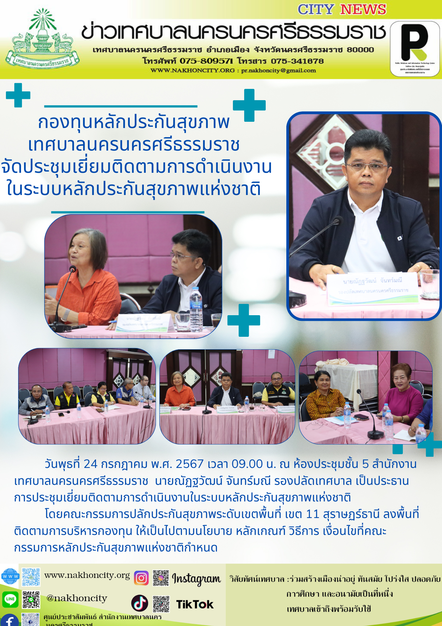 วันพุธที่ 24 กรกฎาคม พ.ศ. 2567 เวลา 09.00 น. ณ ห้องประชุมชั้น 5 สำนักงานเทศบาลนครนครศรีธรรมราช นายณัฏฐวัฒน์ จันทร์มณี รองปลัดเทศบาล เป็นประธานการประชุมเยี่ยมติดตามการดำเนินงานในระบบหลักประกันสุขภาพแห่งชาติ โดยคณะกรรมการปลักประกันสุขภาพระดับเขตพื้นที่ เขต 11 สุราษฏร์ธานี ลงพื้นที่ติดตามการบริหารกองทุน ให้เป็นไปตามนโยบาย หลักเกณฑ์ วิธีการ เงื่อนไขที่คณะกรรมการหลักประกันสุขภาพแห่งชาติกำหนด |