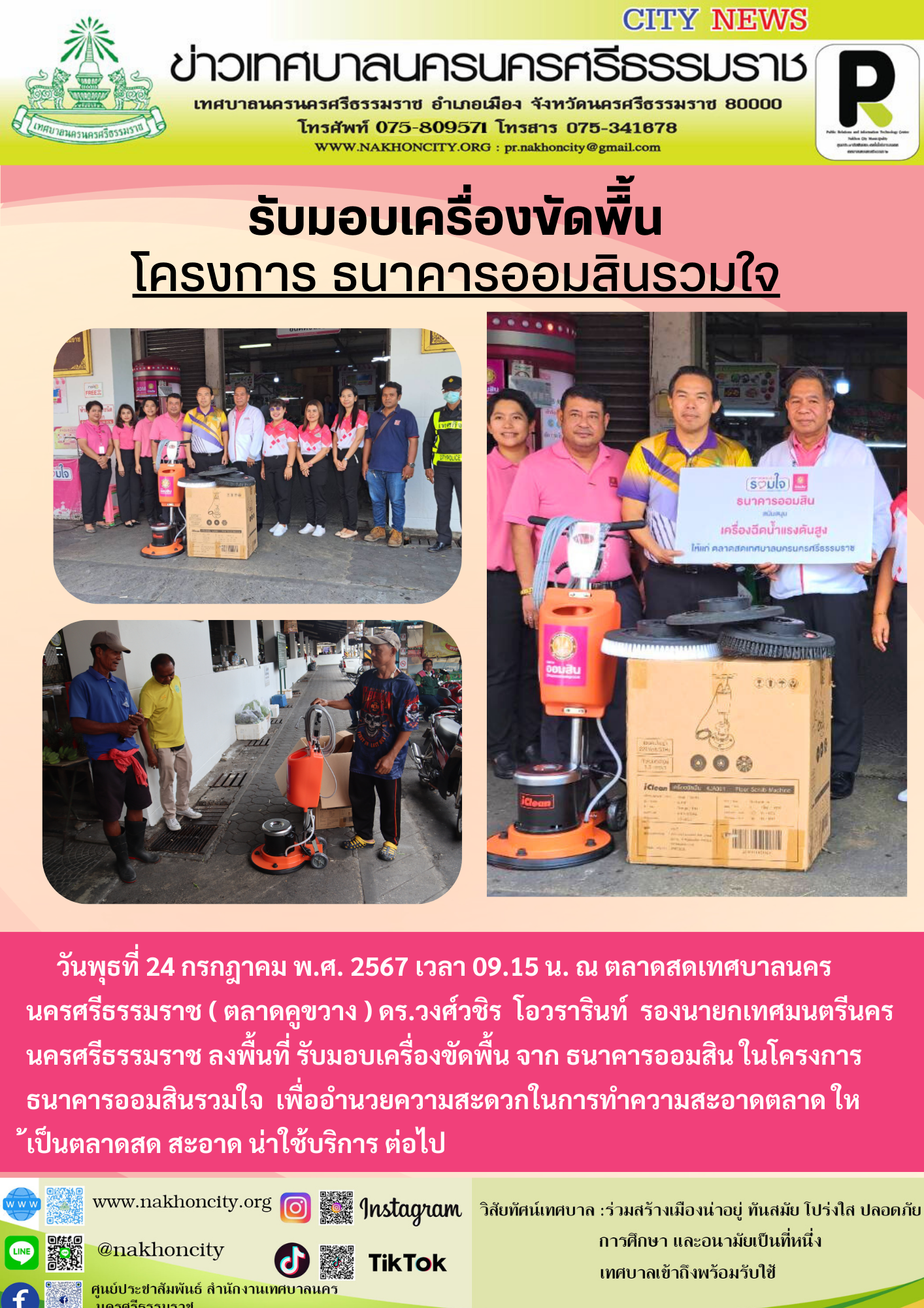 วันพุธที่ 24 กรกฎาคม พ.ศ. 2567 เวลา 09.15 น. ณ ตลาดสดเทศบาลนครนครศรีธรรมราช ( ตลาดคูขวาง ) ดร.วงศ์วชิร โอวรารินท์ รองนายกเทศมนตรีนครนครศรีธรรมราช ลงพื้นที่ รับมอบเครื่องขัดพื้น จาก ธนาคารออมสิน ในโครงการ ธนาคารออมสินรวมใจ เพื่ออำนวยความสะดวกในการทำความสะอาดตลาด ให้เป็นตลาดสด สะอาด น่าใช้บริการ ต่อไป |