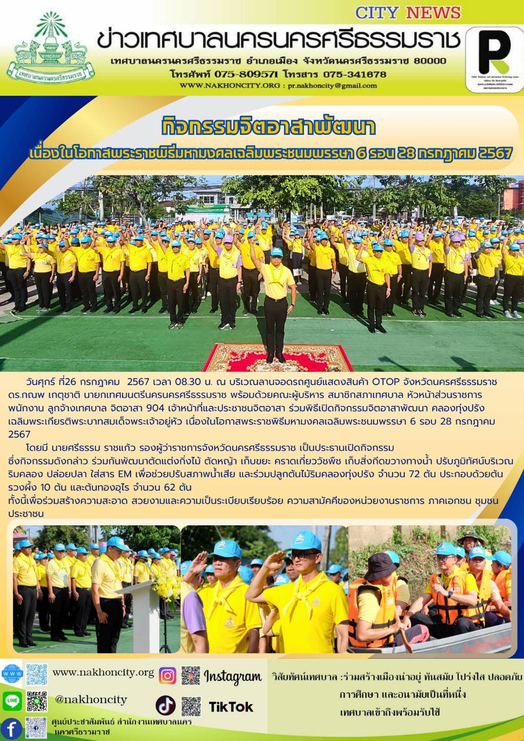 | วันศุกร์ ที่26 กรกฎาคม 2567 เวลา 08.30 น. ณ บริเวณลานจอดรถศูนย์แสดงสินค้า OTOP จังหวัดนครศรีธรรมราช ดร.กณพ เกตุชาติ นายกเทศมนตรีนครนครศรีธรรมราช พร้อมด้วยคณะผู้บริหาร สมาชิกสภาเทศบาล หัวหน้าส่วนราชการ พนักงาน ลูกจ้างเทศบาล จิตอาสา 904 เจ้าหน้าที่และประชาชนจิตอาสา ร่วมพิธีเปิดกิจกรรมจิตอาสาพัฒนา คลองทุ่งปรัง เฉลิมพระเกียรติพระบาทสมเด็จพระเจ้าอยู่หัว เนื่องในโอกาสพระราชพิธีมหามงคลเฉลิมพระชนมพรรษา 6 รอบ 28 กรกฎาคม 2567 โดยมี นายศรีธรรม ราชแก้ว รองผู้ว่าราชการจังหวัดนครศรีธรรมราช เป็นประธานเปิดกิจกรรม ซึ่งกิจกรรมดังกล่าว ร่วมกันพัฒนาตัดแต่งกิ่งไม้ ตัดหญ้า เก็บขยะ คราดเกี่ยววัชพืช เก็บสิ่งกีดขวางทางน้ำ ปรับภูมิทัศน์บริเวณริมคลอง ปล่อยปลา ใส่สาร EM เพื่อช่วยปรับสภาพน้ำเสีย และร่วมปลูกต้นไม้ริมคลองทุ่งปรัง จำนวน 72 ต้น ประกอบด้วยต้นรวงผึ้ง 10 ต้น และต้นทองอุไร จำนวน 62 ต้น ทั้งนี้เพื่อร่วมสร้างความสะอาด สวยงามและความเป็นระเบียบเรียบร้อย ความสามัคคีของหน่วยงานราชการ ภาคเอกชน ชุมชน ประชาชน ……….. ภาพ//ข่าว//จันทร์จิรา ตรวจทาน//ฐิตินันท์ |