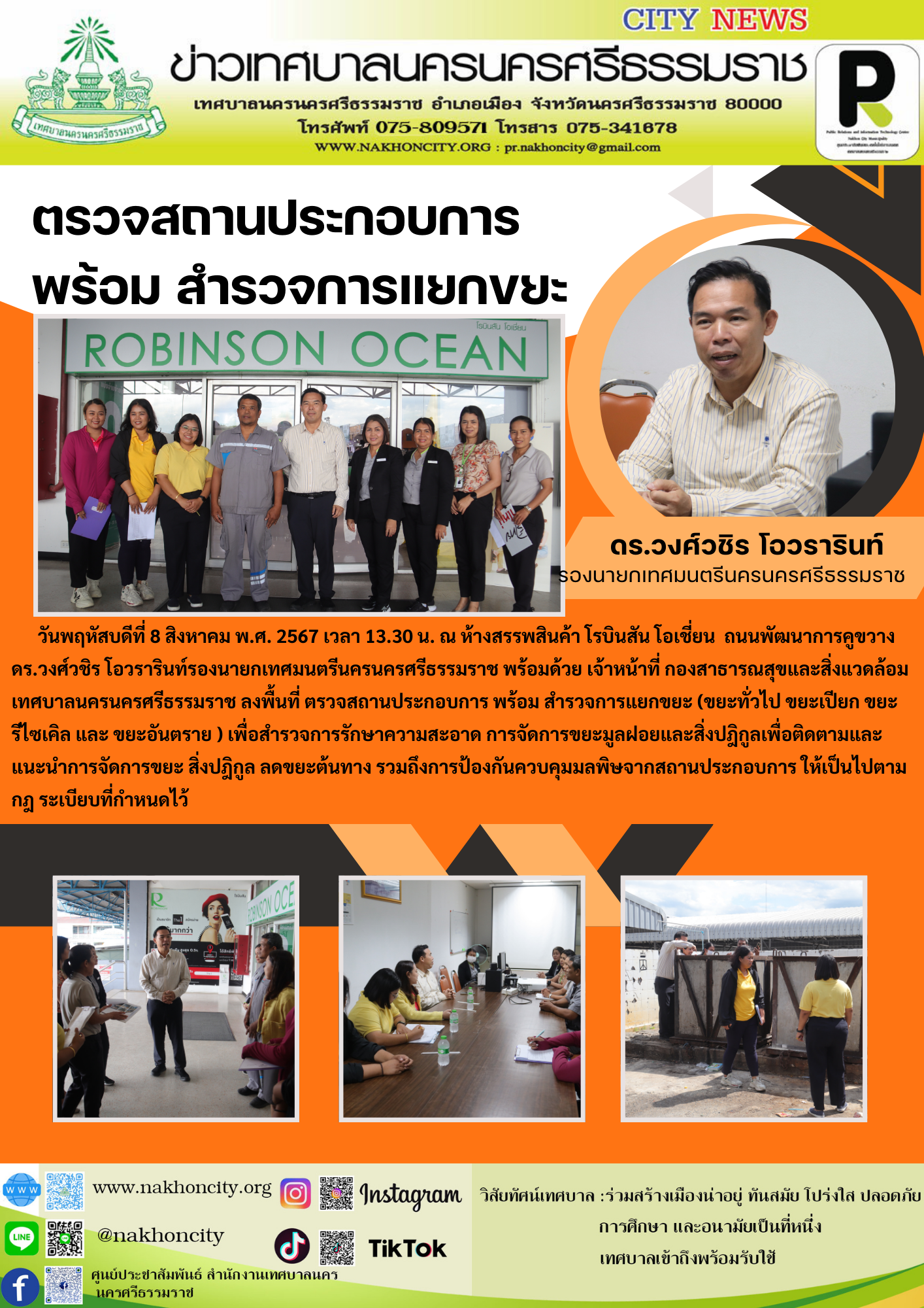 ดร.วงศ์วชิร โอวรารินท์ รองนายกเทศมนตรีนครนครศรีธรรมราช พร้อมด้วย เจ้าหน้าที่ กองสาธารณสุขและสิ่งแวดล้อม เทศบาลนครนครศรีธรรมราช ลงพื้นที่ ตรวจสถานประกอบการ พร้อม สำรวจการแยกขยะ ณ ห้างสรรพสินค้า โรบินสัน โอเชี่ยน |