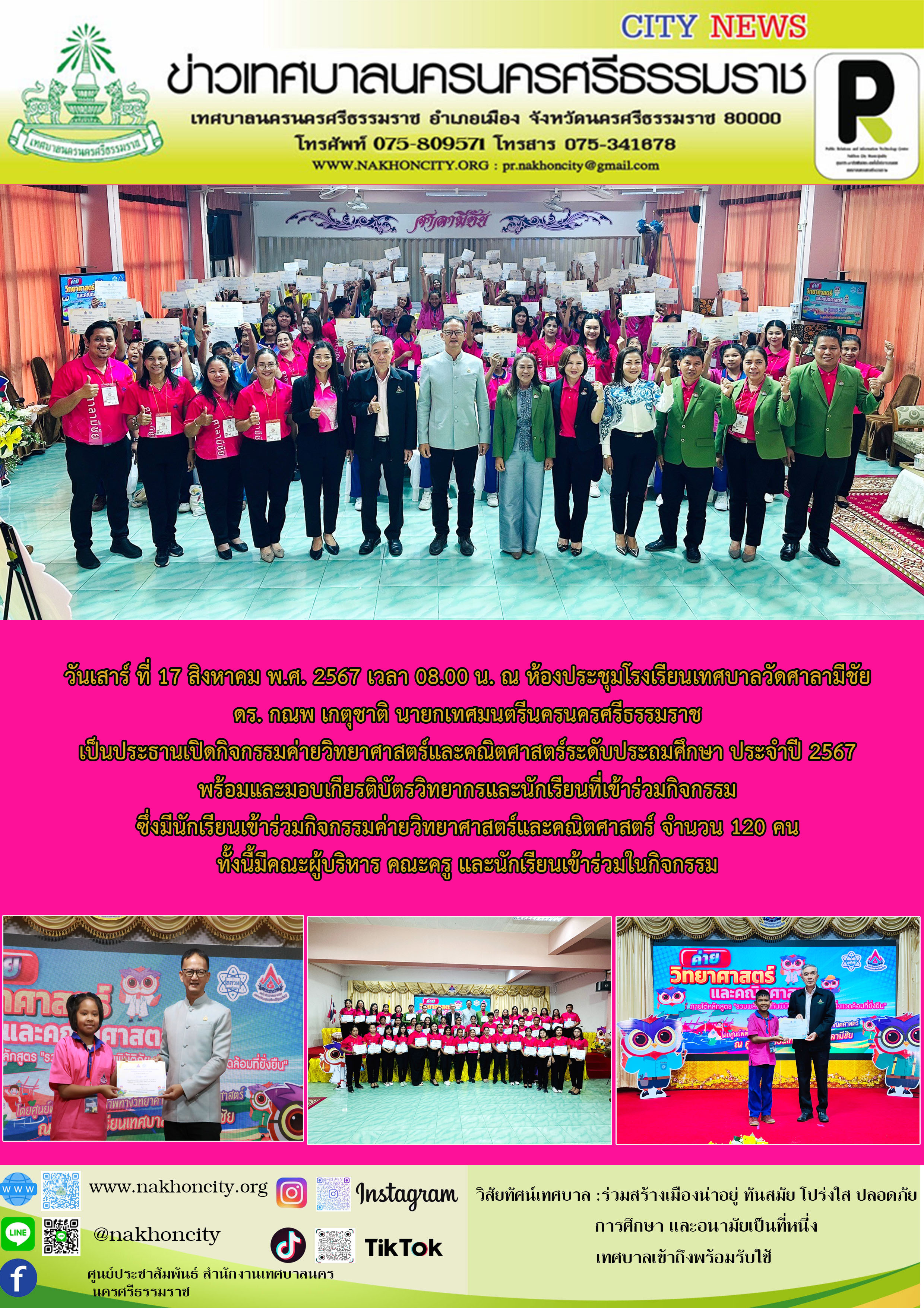 นายกเทศมนตรีนครนครศรีธรรมราชเป็นประธานเปิดกิจกรรมค่ายวิทยาศาสตร์และคณิตศาสตร์ระดับประถมศึกษา ประจำปี 2567 พร้อมและมอบเกียรติบัตร วิทยากรและนักเรียนที่เข้าร่วมกิจกรรม |