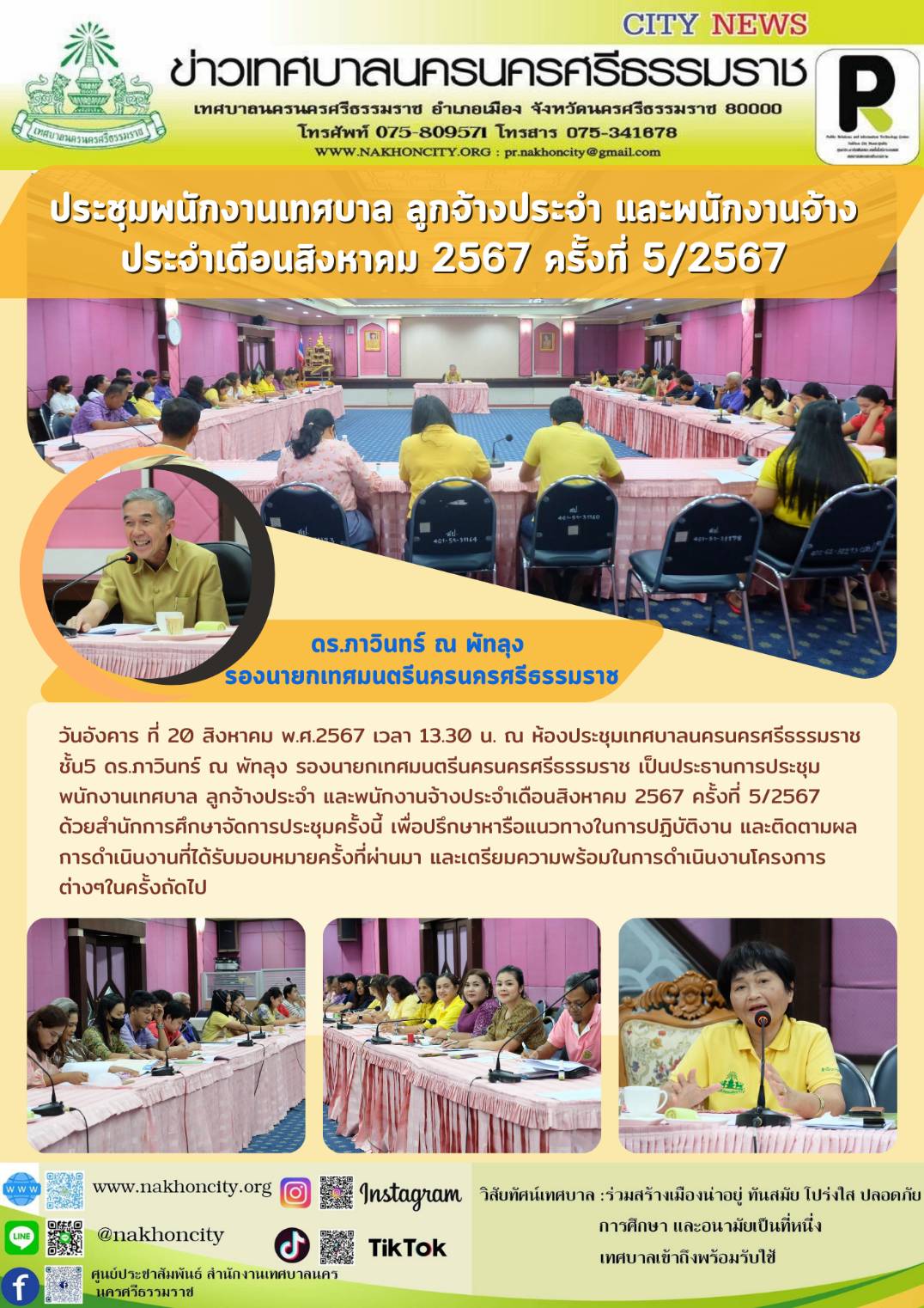 วันอังคาร ที่ 20 สิงหาคม พ.ศ.2567 เวลา 13.30 น. ณ ห้องประชุมเทศบาลนครนครศรีธรรมราช ชั้น5 ดร.ภาวินทร์ ณ พัทลุง รองนายกเทศมนตรีนครนครศรีธรรมราช เป็นประธานการประชุมพนักงานเทศบาล ลูกจ้างประจำ และพนักงานจ้างประจำเดือนสิงหาคม 2567 ครั้งที่ 5/2567