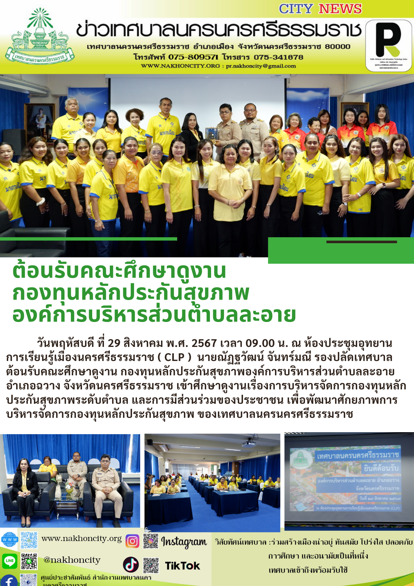 วันพฤหัสบดี ที่ 29 สิงหาคม พ.ศ. 2567 เวลา 09.00 น. ณ ห้องประชุมอุทยานการเรียนรู้เมืองนครศรีธรรมราช ( CLP ) นายณัฏฐวัฒน์ จันทร์มณี รองปลัดเทศบาล ต้อนรับคณะศึกษาดูงาน กองทุนหลักประกันสุขภาพองค์การบริหารส่วนตำบลละอาย อำเภอฉวาง จังหวัดนครศรีธรรมราช เข้าศึกษาดูงานเรื่องการบริหารจัดการกองทุนหลักประกันสุขภาพระดับตำบล และการมีส่วนร่วมของประชาชน เพื่อพัฒนาศักยภาพการบริหารจัดการกองทุนหลักประกันสุขภาพ ของเทศบาลนครนครศรีธรรมราช |
