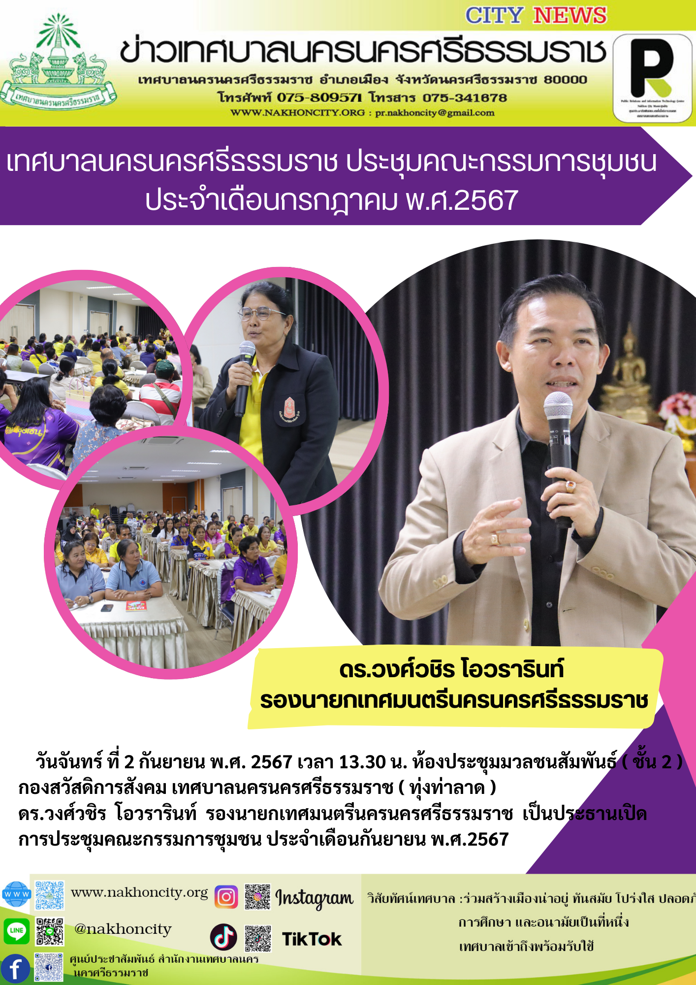 ดร.วงศ์วชิร โอวรารินท์ รองนายกเทศมนตรีนครนครศรีธรรมราช เป็นประธานเปิด การประชุมคณะกรรมการชุมชน ประจำเดือนกันยายน พ.ศ.2567