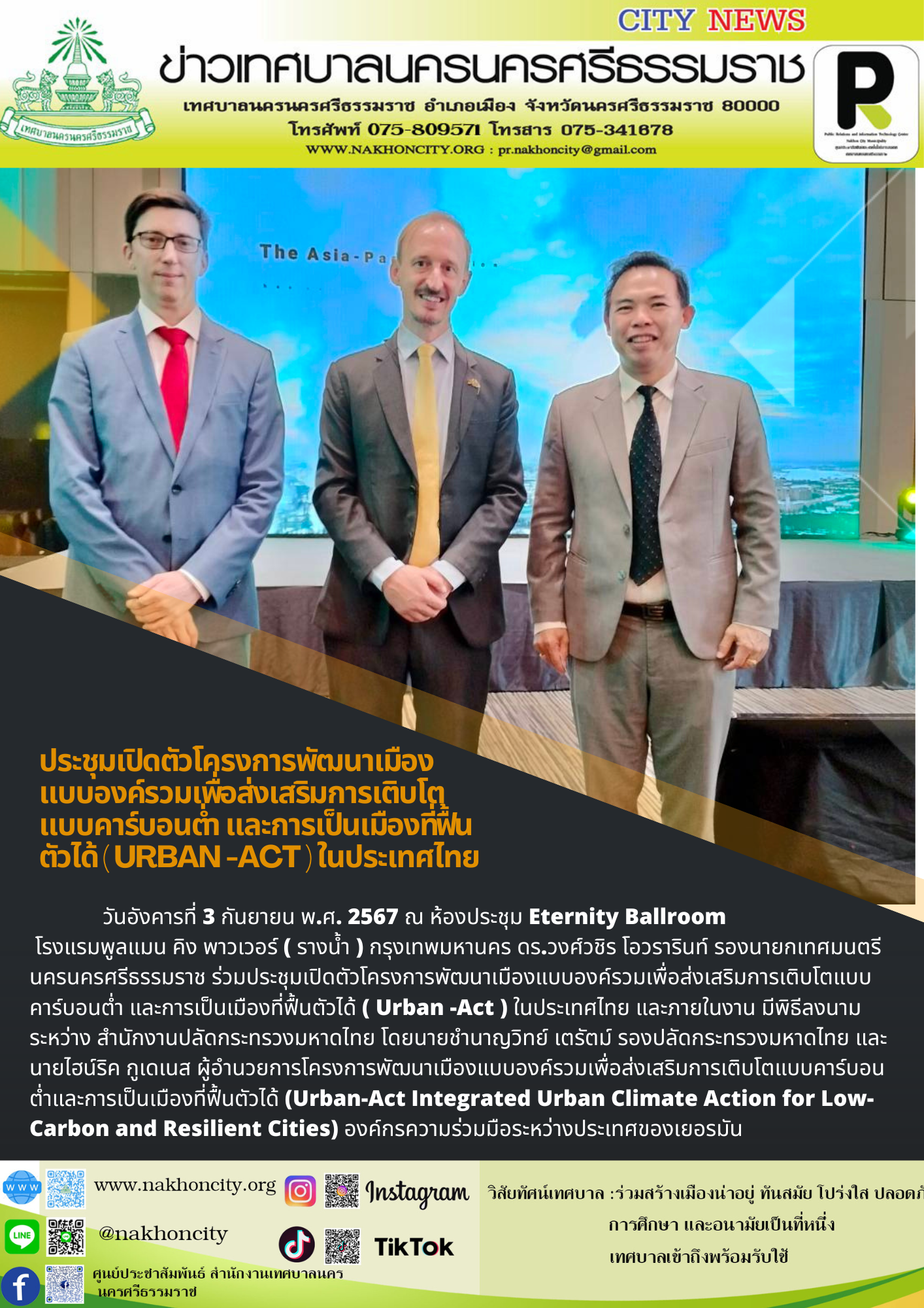 วันอังคารที่ 3 กันยายน พ.ศ. 2567 ณ ห้องประชุม Eternity Ballroom โรงแรมพูลแมน คิง พาวเวอร์ ( รางน้ำ ) กรุงเทพมหานคร ดร.วงศ์วชิร โอวรารินท์ รองนายกเทศมนตรีนครนครศรีธรรมราช ร่วมประชุมเปิดตัวโครงการพัฒนาเมืองแบบองค์รวมเพื่อส่งเสริมการเติบโตแบบคาร์บอนต่ำ และการเป็นเมืองที่ฟื้นตัวได้ ( Urban -Act ) ในประเทศไทย และภายในงาน มีพิธีลงนาม ระหว่าง สำนักงานปลัดกระทรวงมหาดไทย โดยนายชำนาญวิทย์ เตรัตม์ รองปลัดกระทรวงมหาดไทย และ นายไฮน์ริค กูเดเนส ผู้อำนวยการโครงการพัฒนาเมืองแบบองค์รวมเพื่อส่งเสริมการเติบโตแบบคาร์บอนต่ำและการเป็นเมืองที่ฟื้นตัวได้ (Urban-Act Integrated Urban Climate Action for Low-Carbon and Resilient Cities) องค์กรความร่วมมือระหว่างประเทศของเยอรมัน