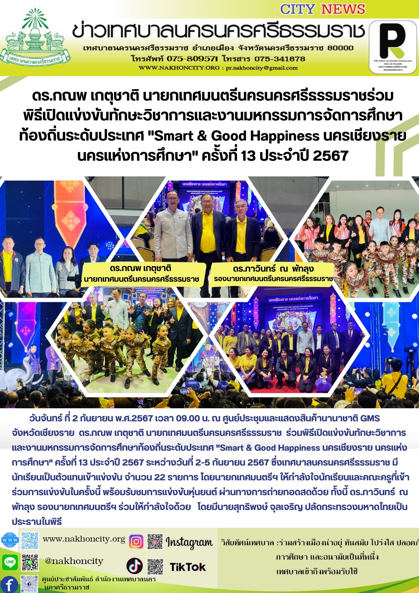 นายกเทศมนตรีนครนครศรีธรรมราชร่วมพิธีเปิดแข่งขันทักษะวิชาการและงานมหกรรมการจัดการศึกษาท้องถิ่นระดับประเทศ "Smart & Good Happiness นครเชียงราย นครแห่งการศึกษา" ครั้งที่ 13 ประจำปี 2567 |