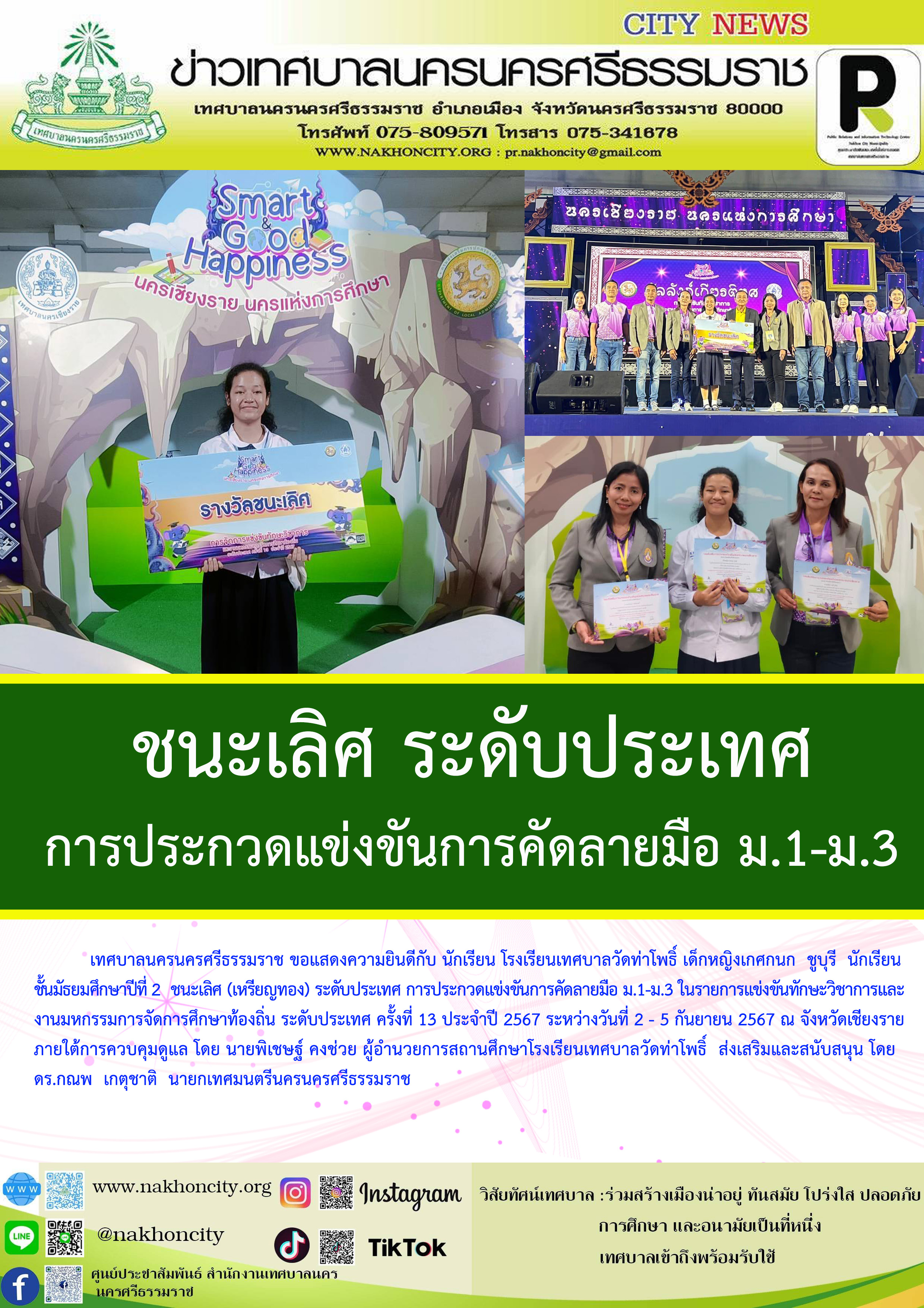 เทศบาลนครนครศรีธรรมราช ขอแสดงความยินดีกับ นักเรียน โรงเรียนเทศบาลวัดท่าโพธิ์ เด็กหญิงเกศกนก ชูบุรี นักเรียนชั้นมัธยมศึกษาปีที่ 2  ชนะเลิศ ระดับประเทศ การประกวดแข่งขันการคัดลายมือ ม.1-ม.3  ในรายการแข่งขันทักษะวิชาการและงานมหกรรมการจัดการศึกษาท้องถิ่น ระดับประเทศ ครั้งที่ 13 ประจำปี 2567 ระหว่างวันที่ 2 - 5 กันยายน 2567 ณ จังหวัดเชียงราย ภายใต้การควบคุมดูแล โดย นายพิเชษฐ์ คงช่วย ผู้อำนวยการโรงเรียนเทศบาลวัดท่าโพธิ์  ส่งเสริมและสนับสนุน โดย ดร.กณพ  เกตุชาติ  นายกเทศมนตรีนครนครศรีธรรมราช